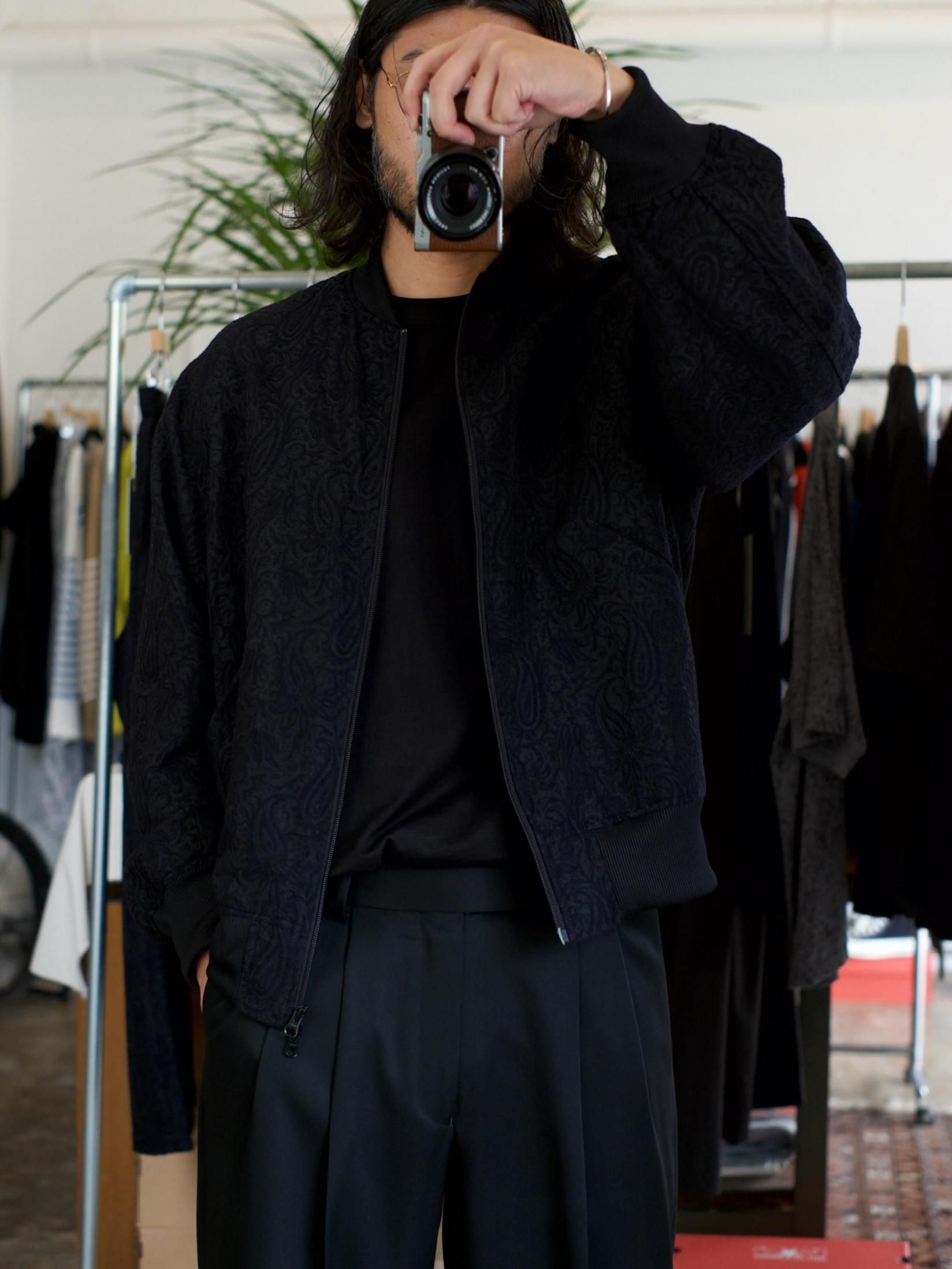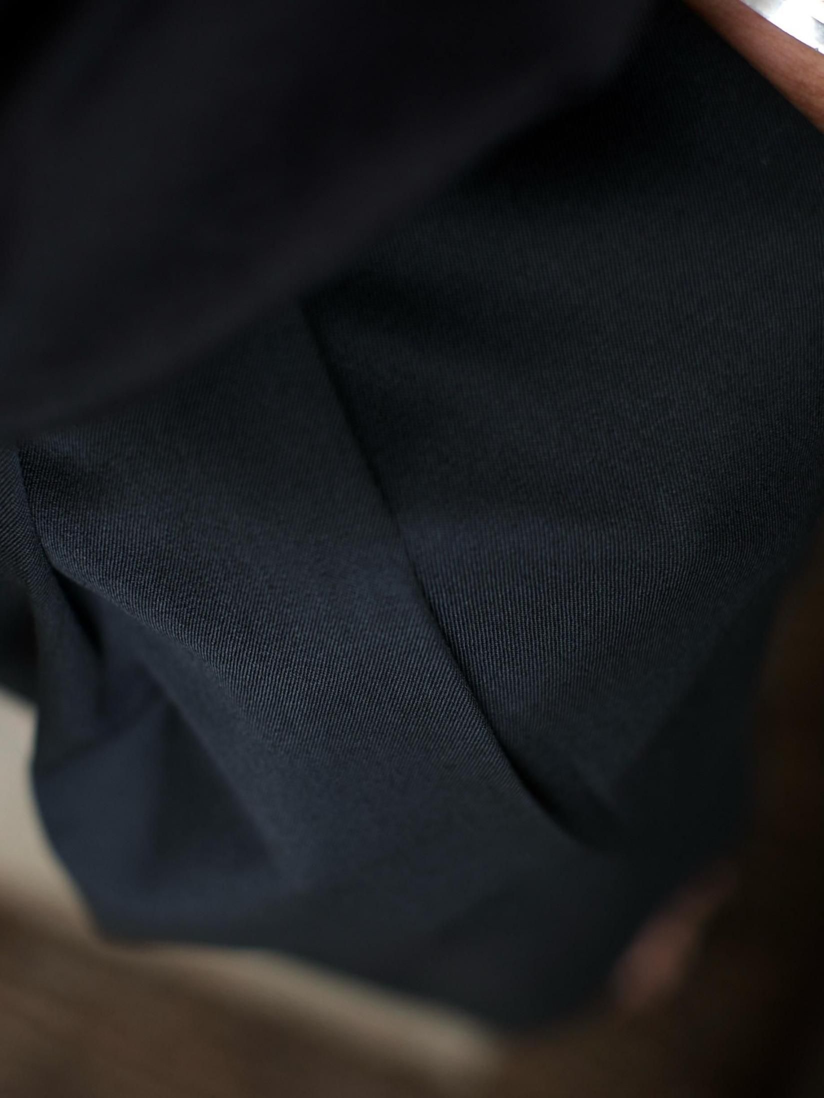 フロントには2本のアウトタックを施し、立体的なドレープが生まれます。裾にかけて緩やかにテーパードすることで、ワイドながらも洗練された大人のラインに。