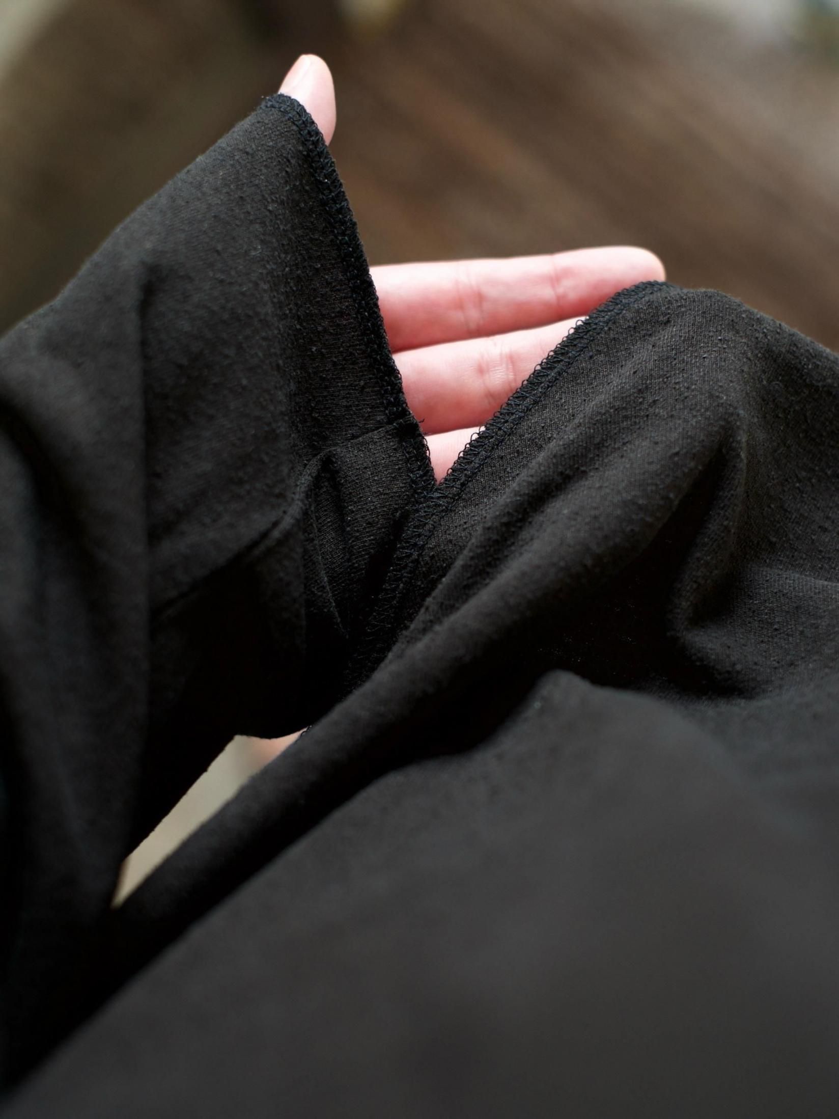 デザイン性は省いていますが、裾はラウンドした形状で、生地端はロック縫い処理することでラフな印象を持たせています。