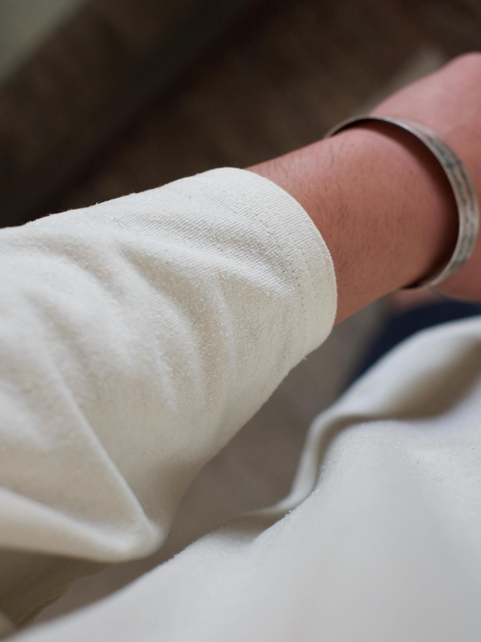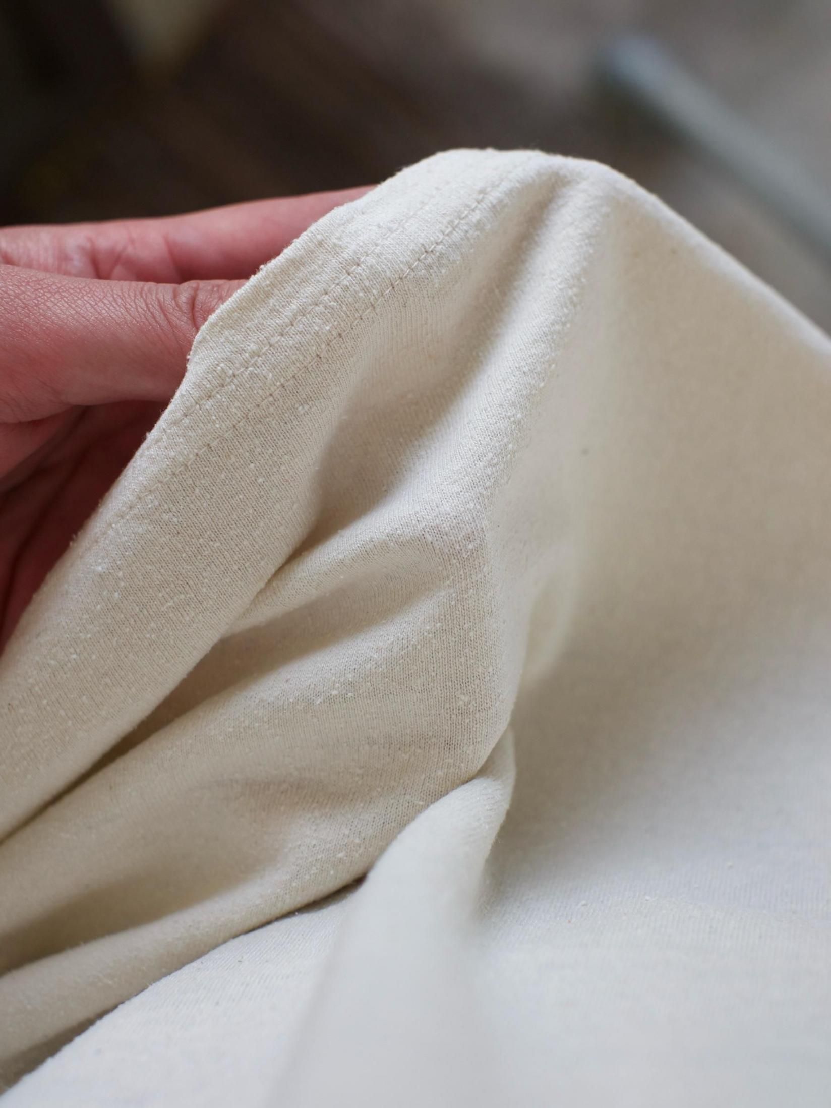 節(ネップ)があり、コットンのようなザックリとしたカジュアルさのなかに、シルクならではのヌメり感を持っているのが特徴です。