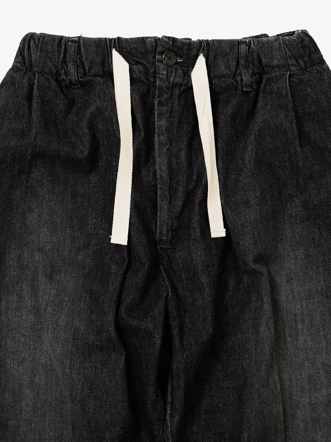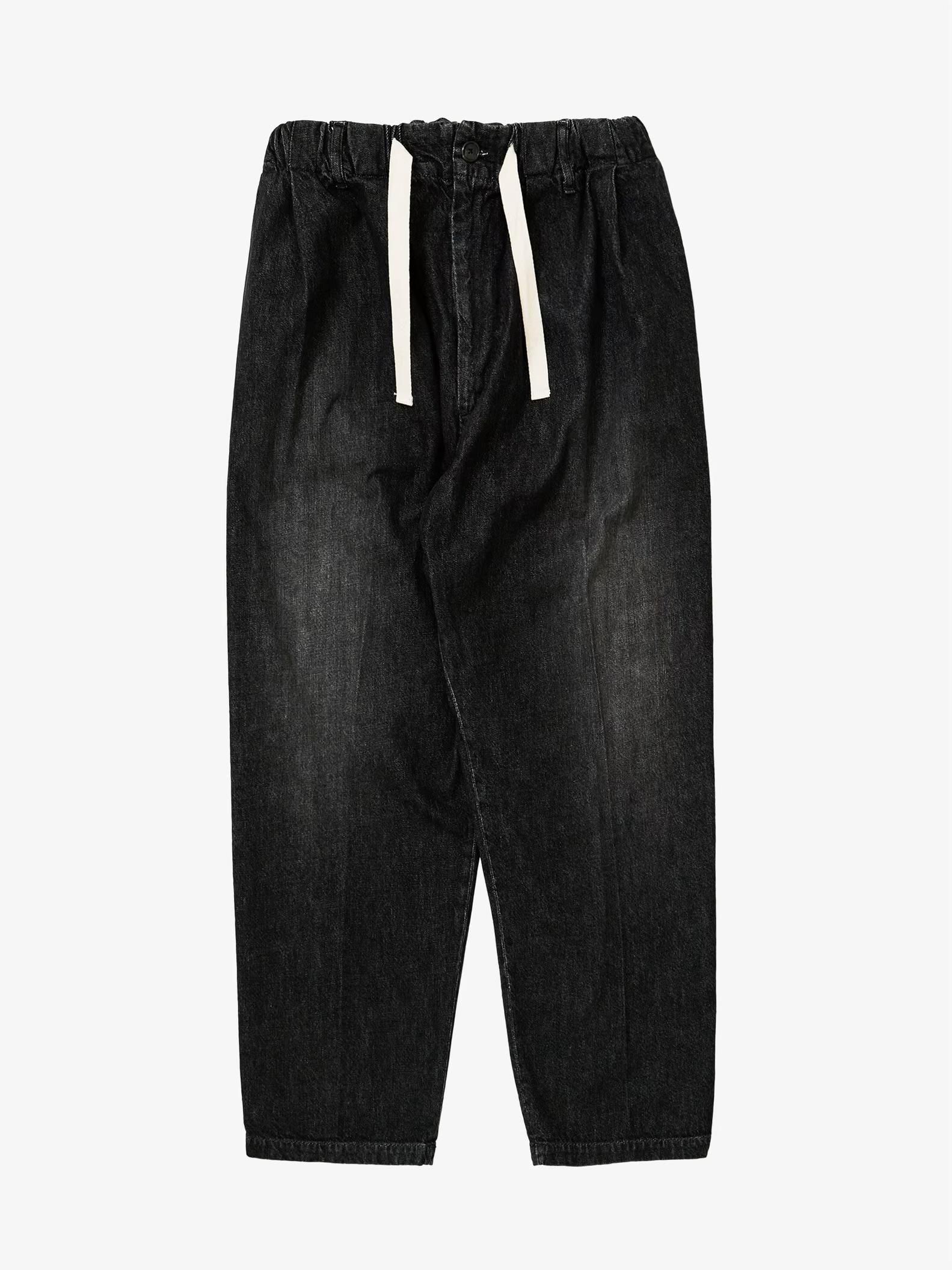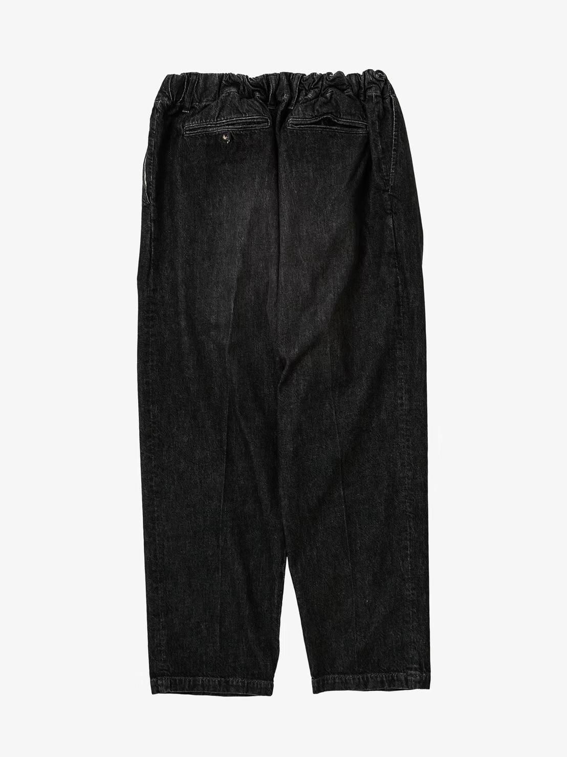スーパーワイドなウエストを2タックとウエストゴムやドローコードでイージーパンツ仕様にし、裾にかけてテーパードさせたパンツ。