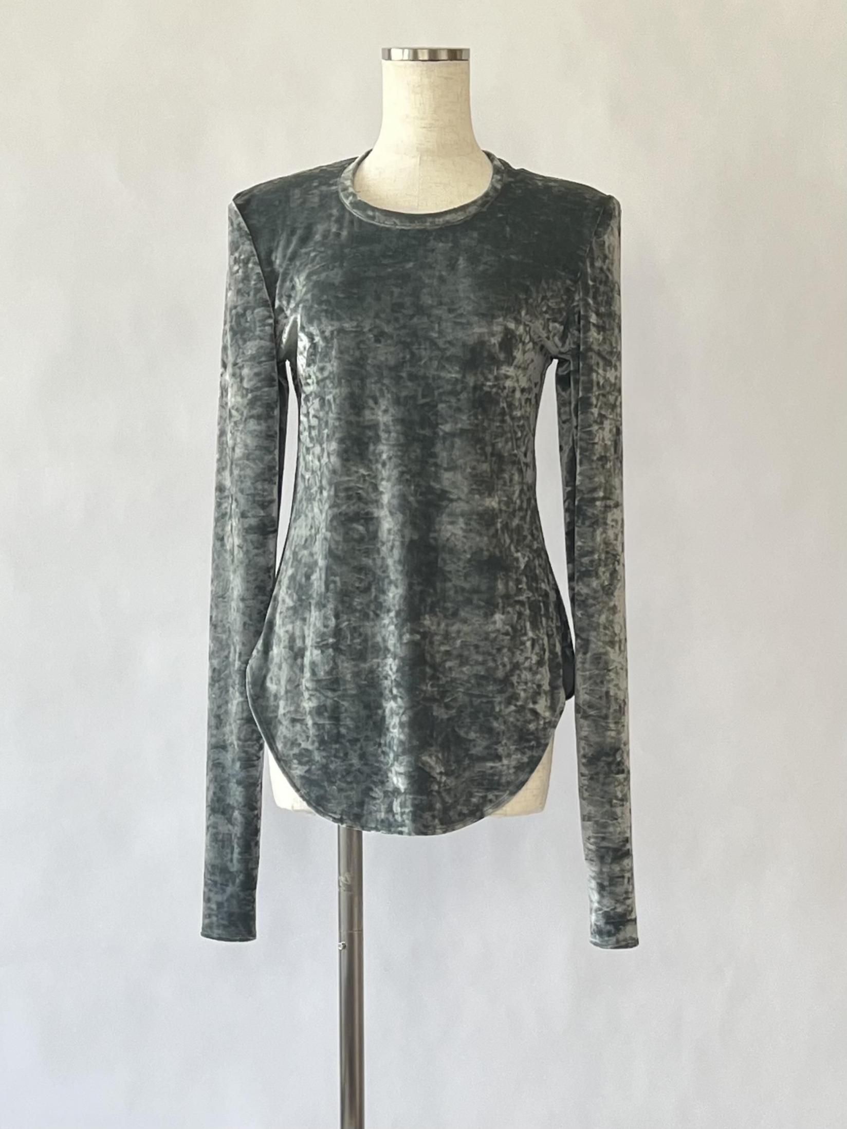 肩パッド付&着丈も長く、ベロアの光沢感で主役としてスタイリングできるカットソーです。