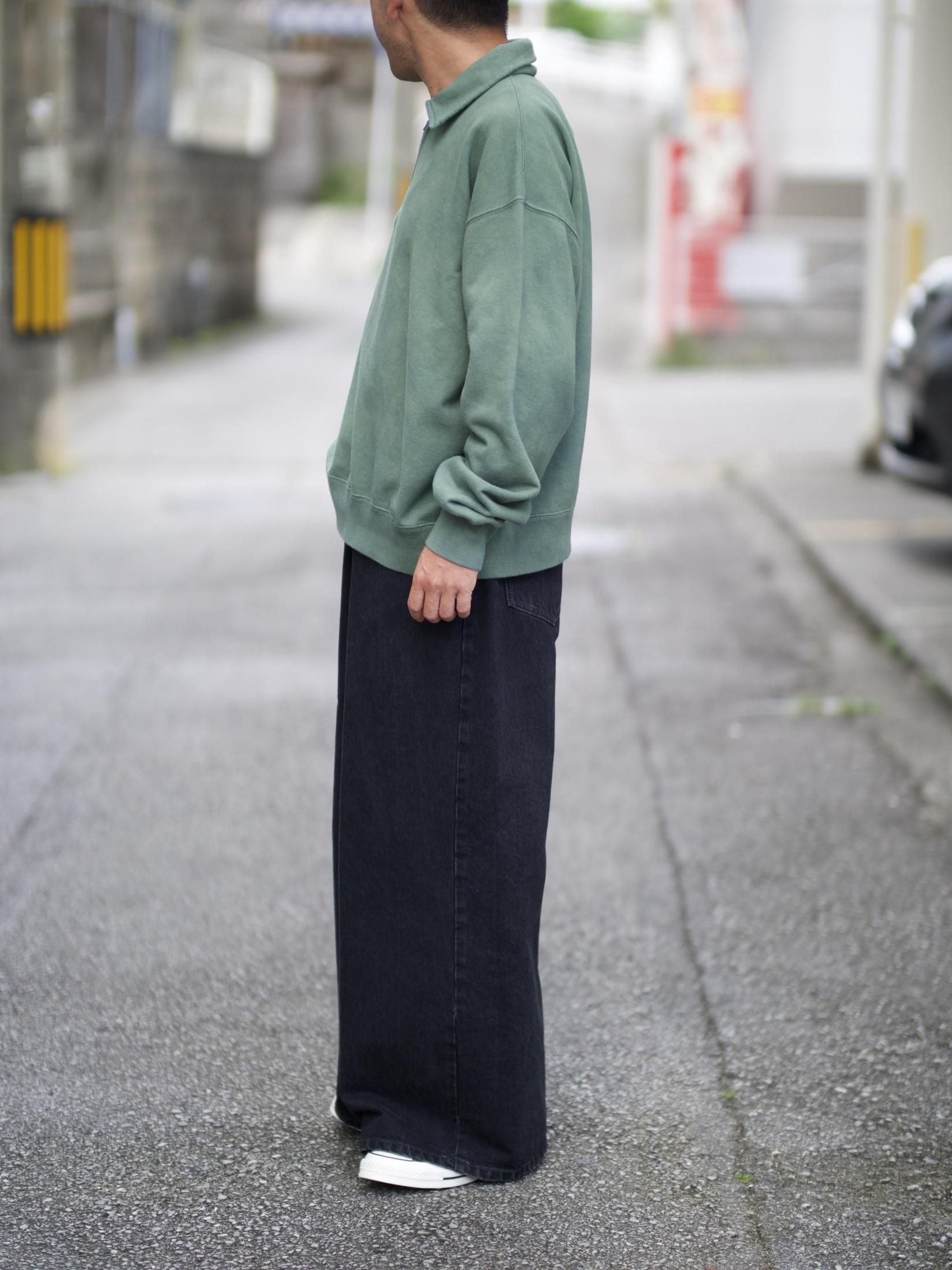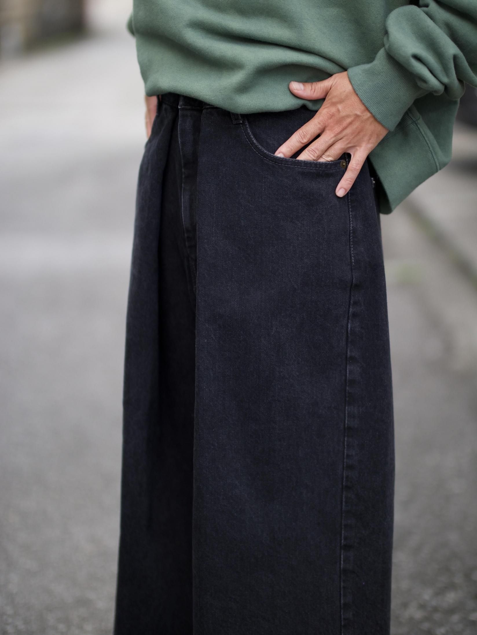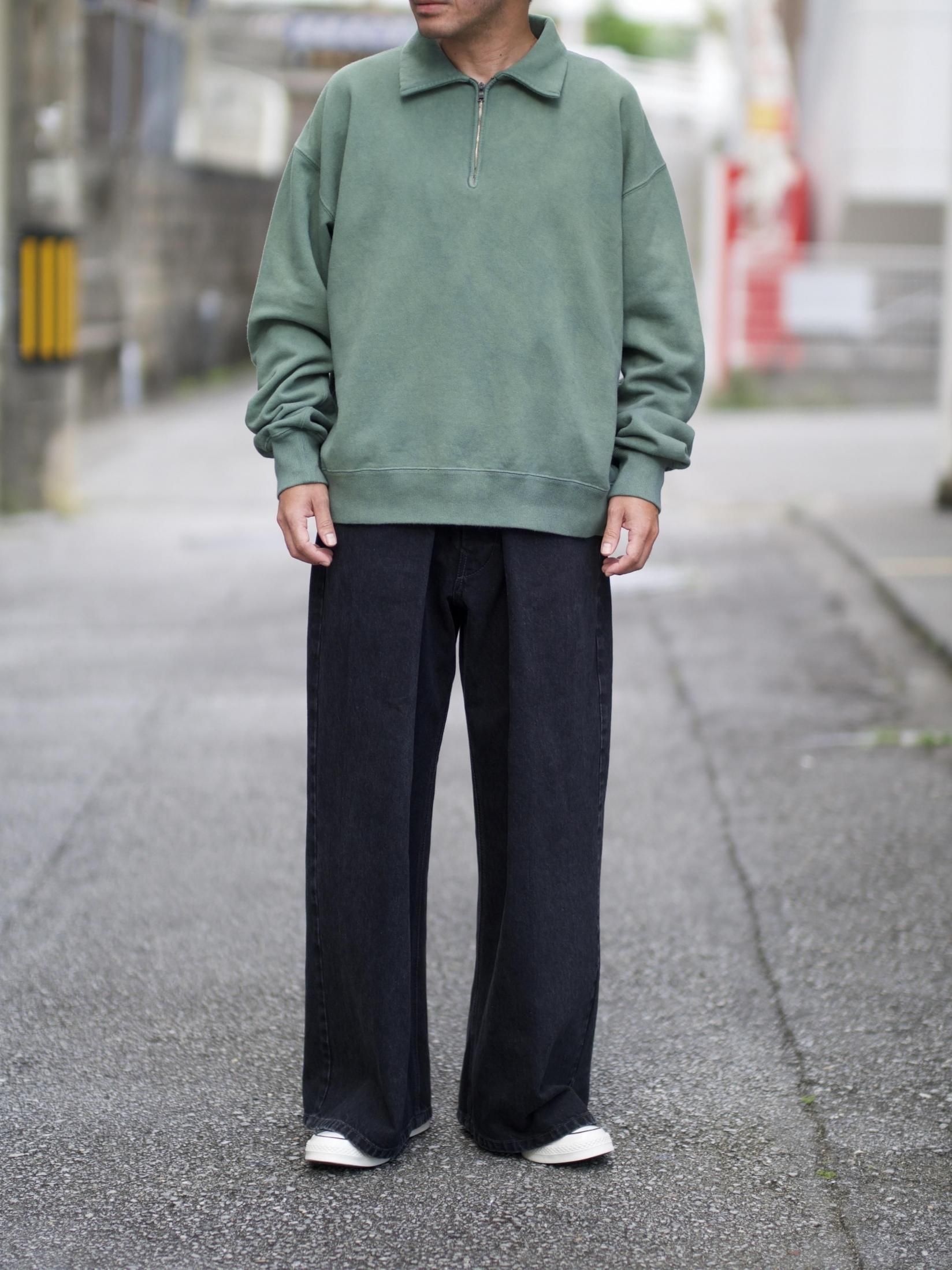 上品な表情と色味が特徴的なデニムタックッドパンツ。