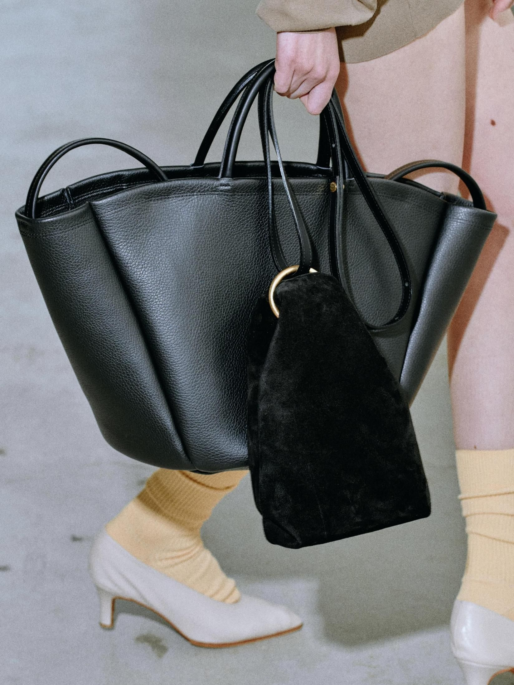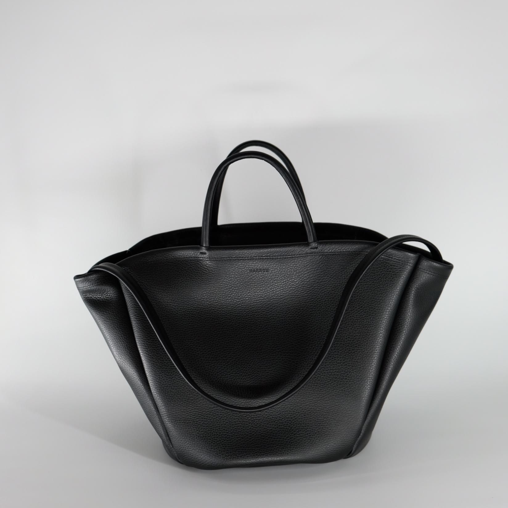 大きなフォルムにあえて短く小さい丸手を付けることで、カジュアルやコンサバな印象になり過ぎないよう、ユニークさとハンドバッグのニュアンスを残すことに拘っている。