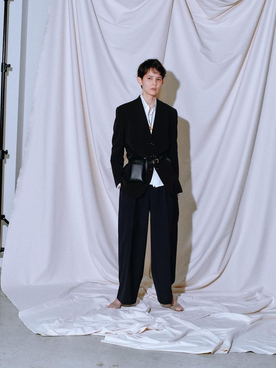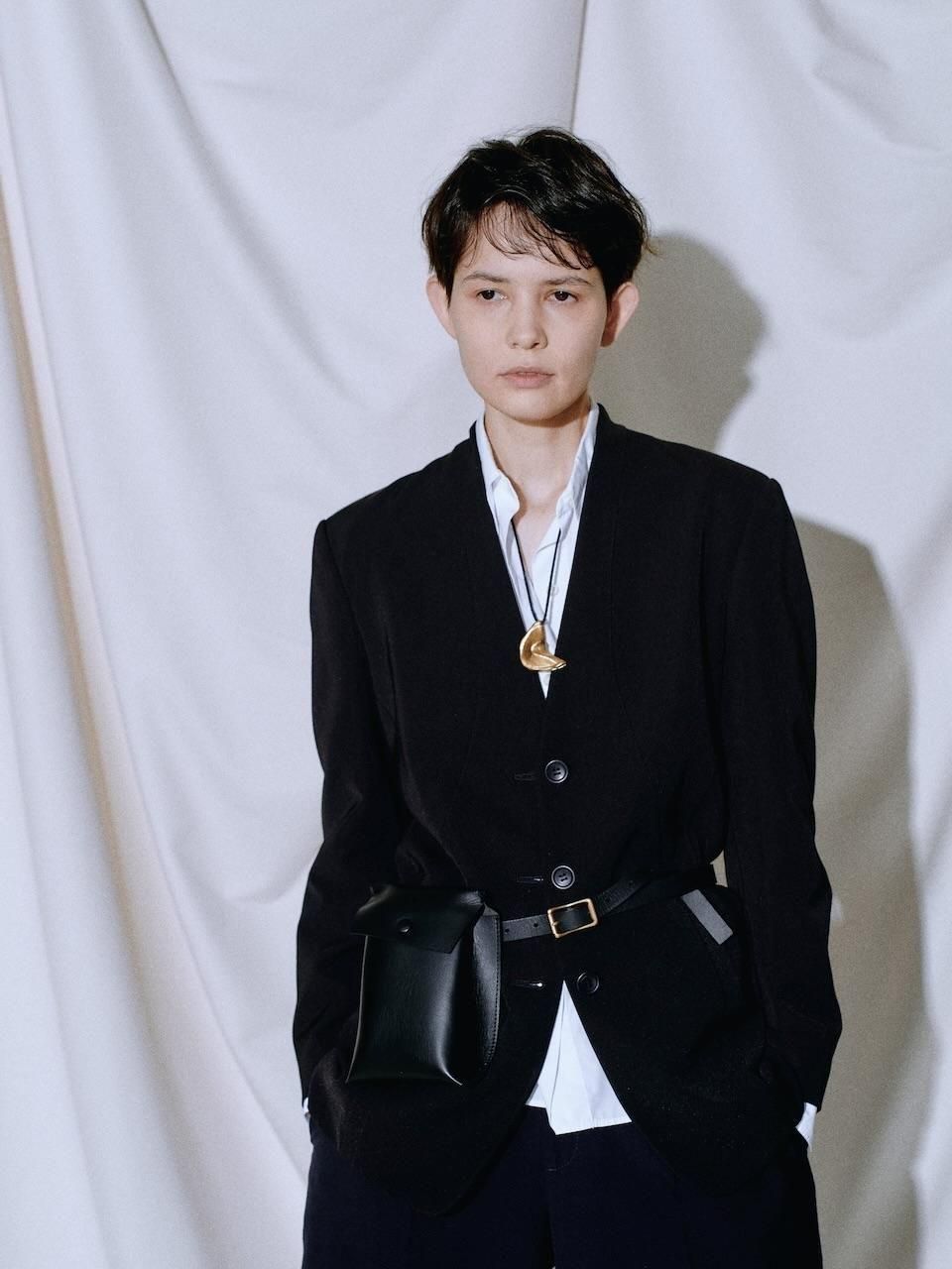 ポーチ部分は1枚の革を立体感が出るようつまんで縫製した形状が最大の特徴となる。