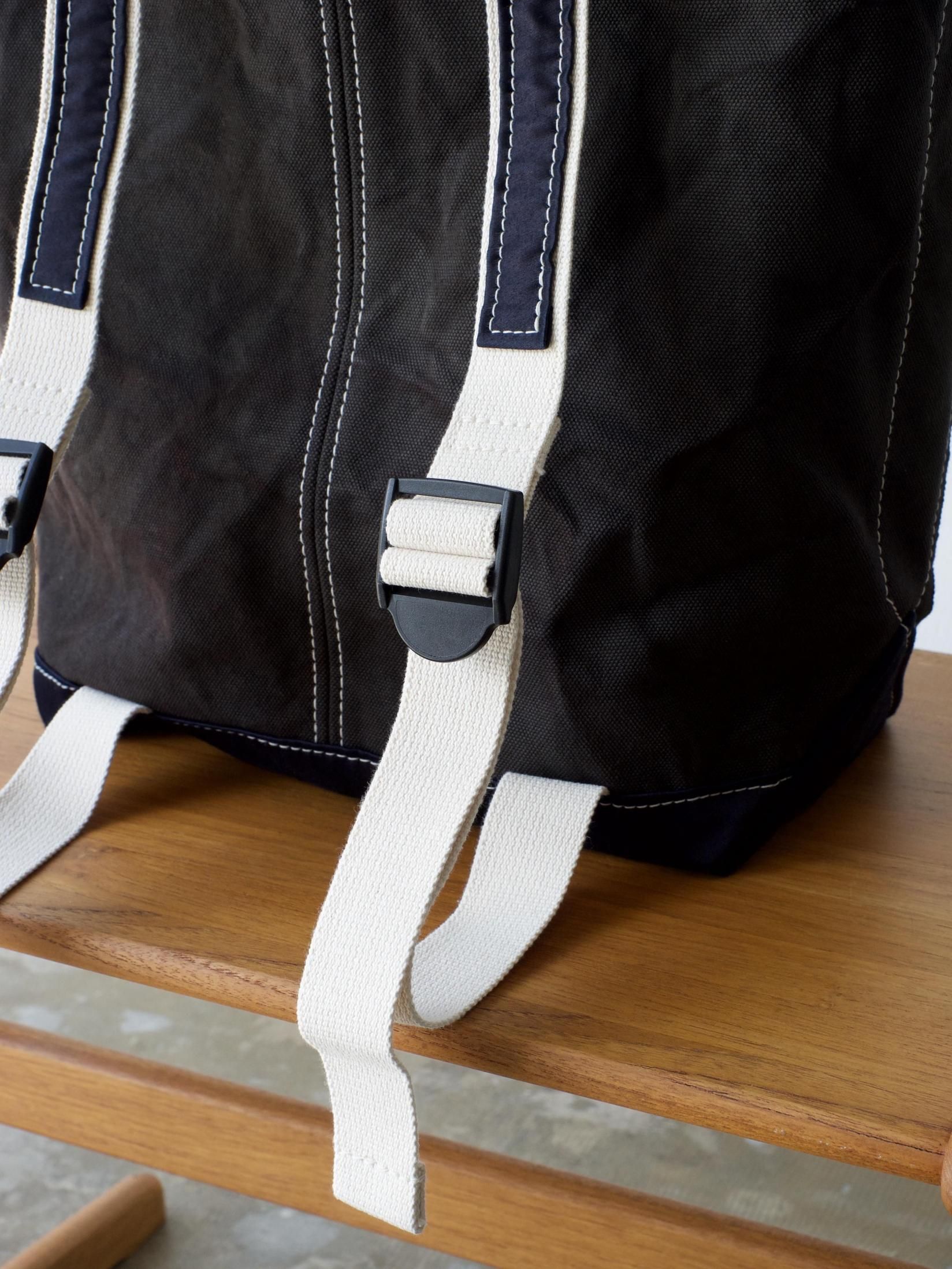 ベースの4号帆布を手染めでインディゴ染を施し、outil素材とコンビで使用。