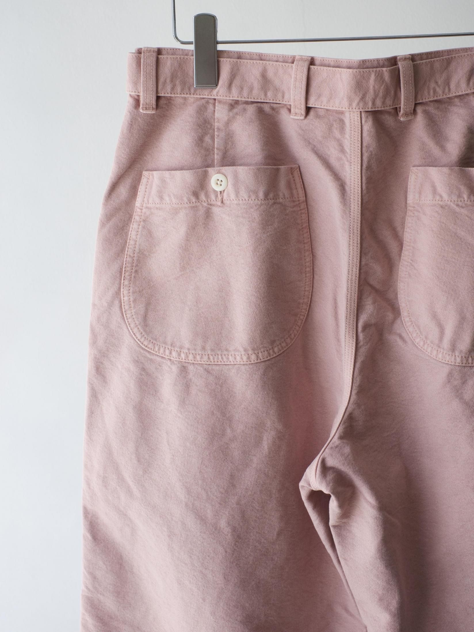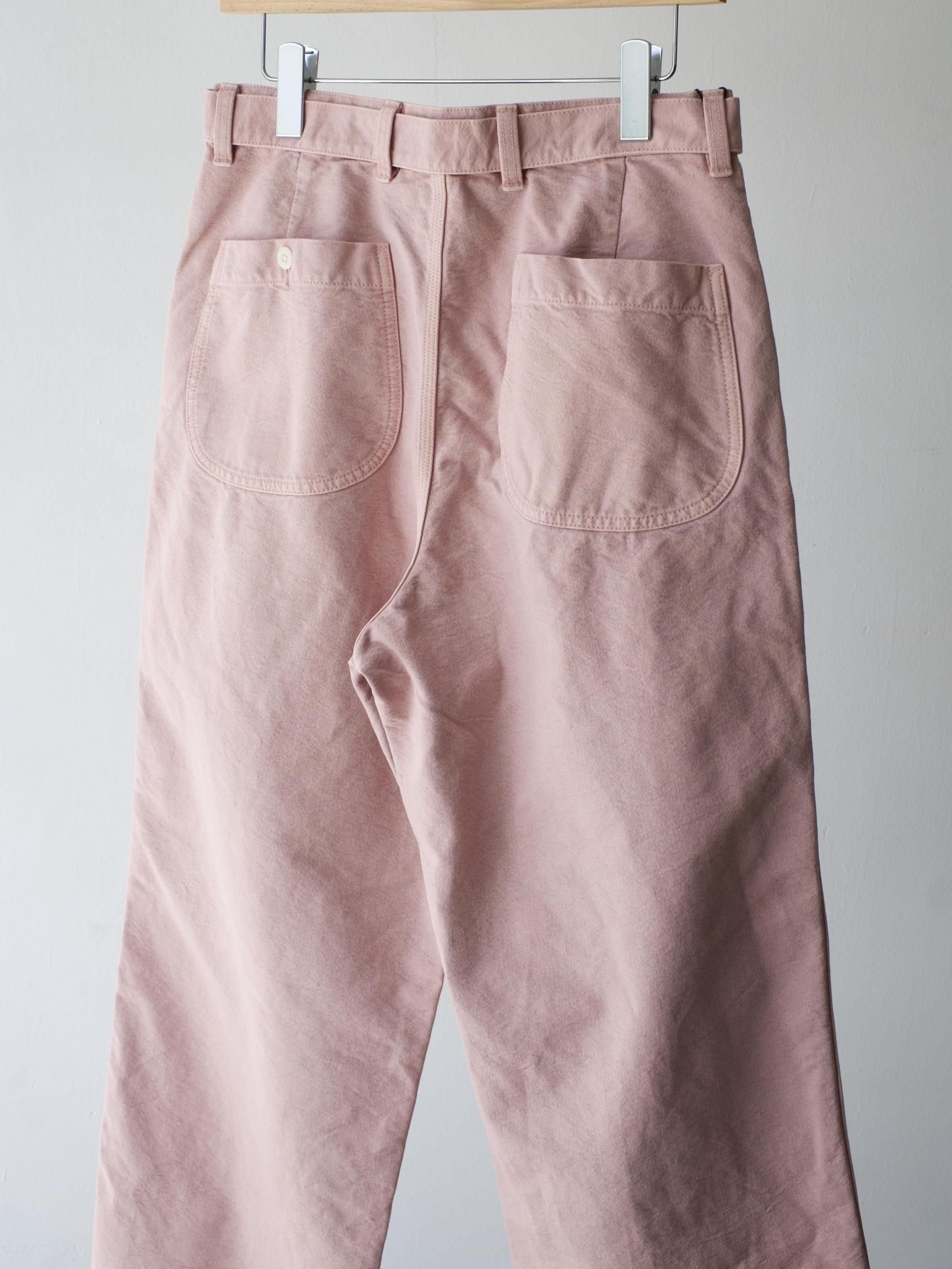 ウエストに配した共地のベルトや、やや丸みのあるバックポケットのディテールが特徴です。
