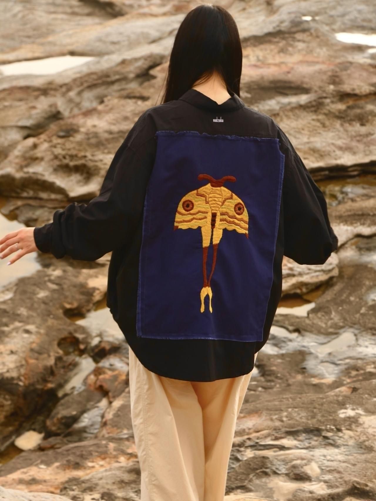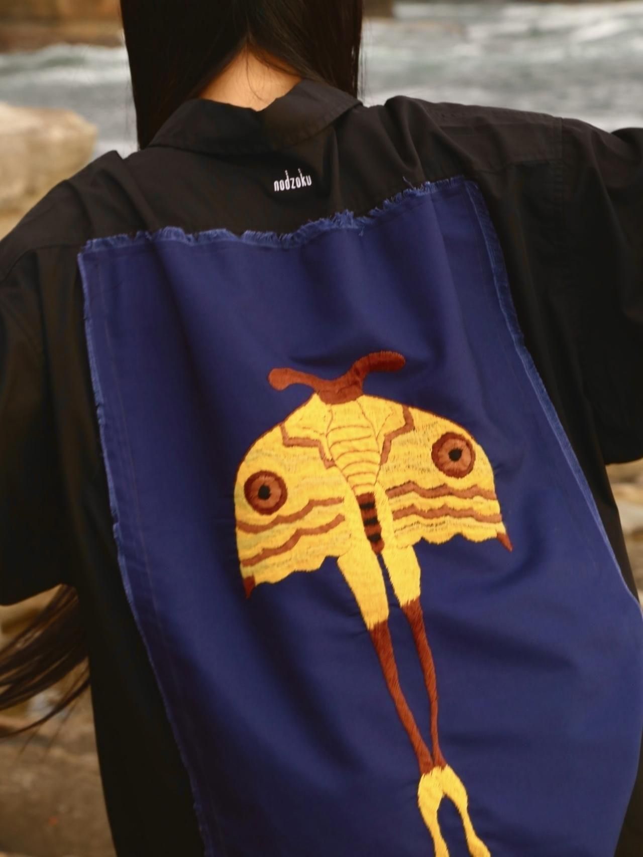 現地でポピュラーな動物パンサーカメレオンとオナガヤママユを、手刺繍で一枚一枚、丁寧に時間をかけて仕上げて頂いたアートピースなシャツ。