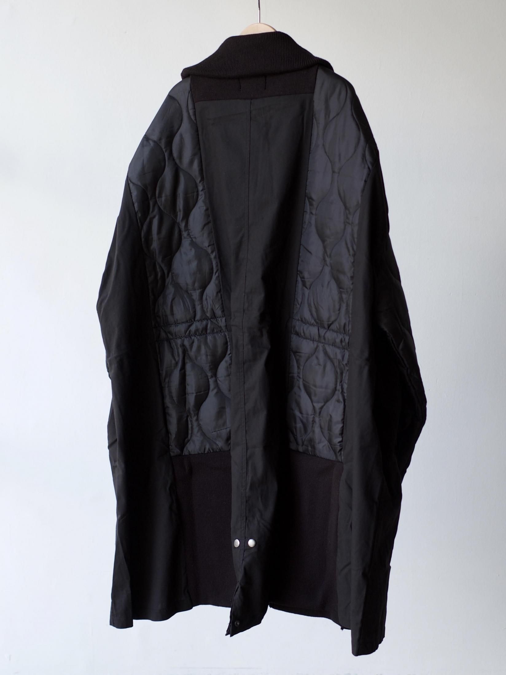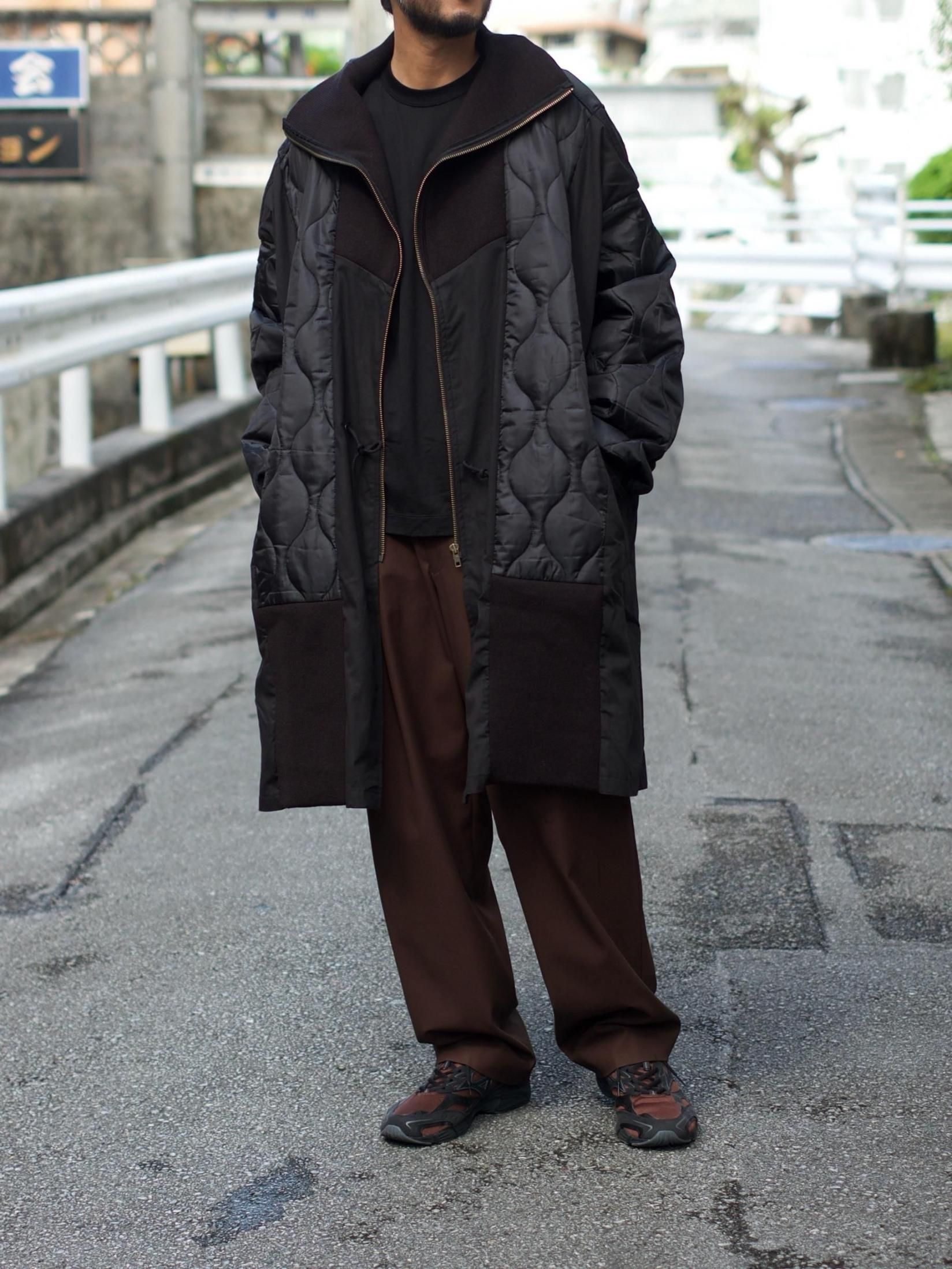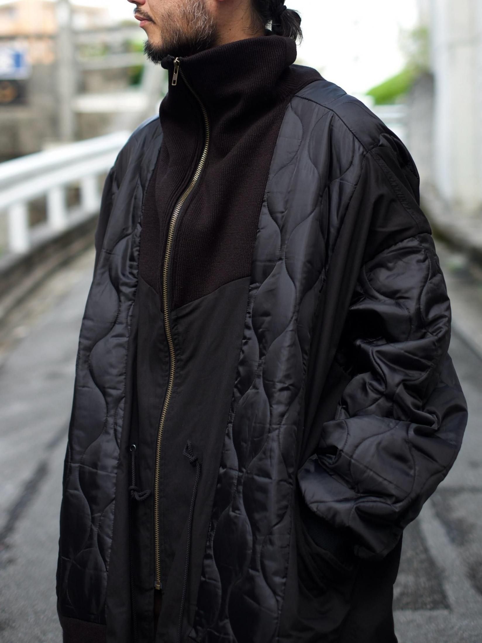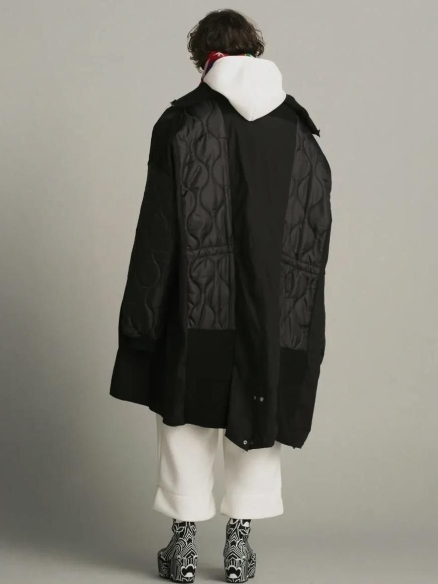 ・シェルを肩口から縦に裁断しライナーの身頃を縫製しワイドシルエットに、不足する着丈分裾に製品のリブを配し着丈を調整しつつアクセントに