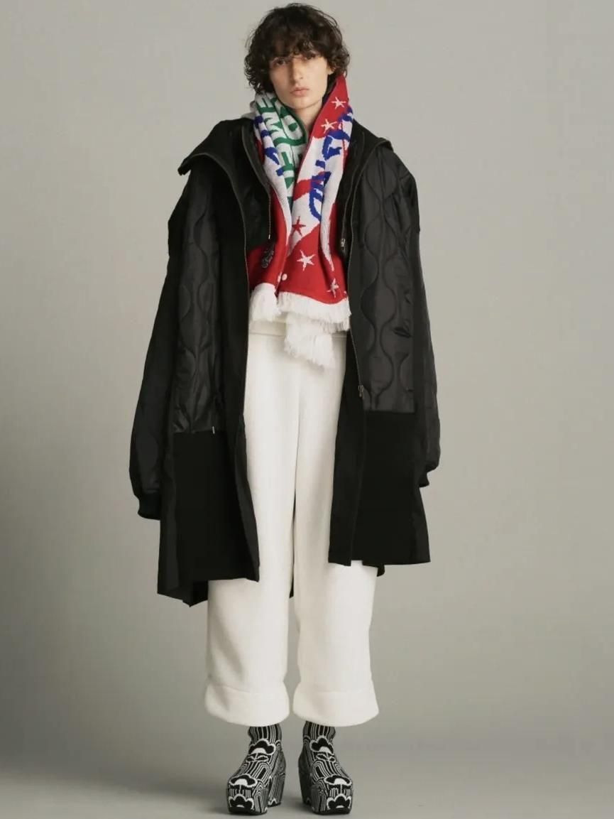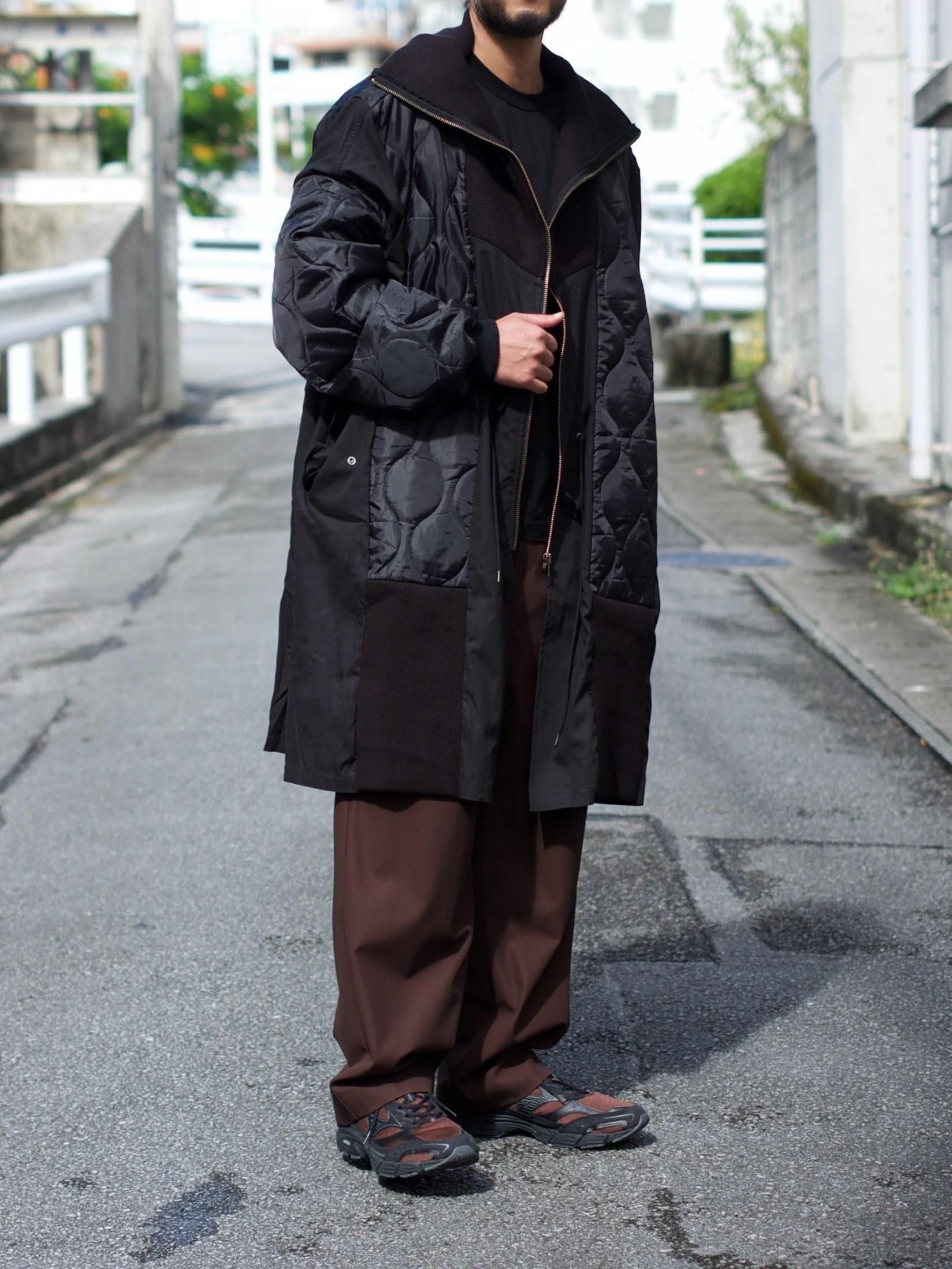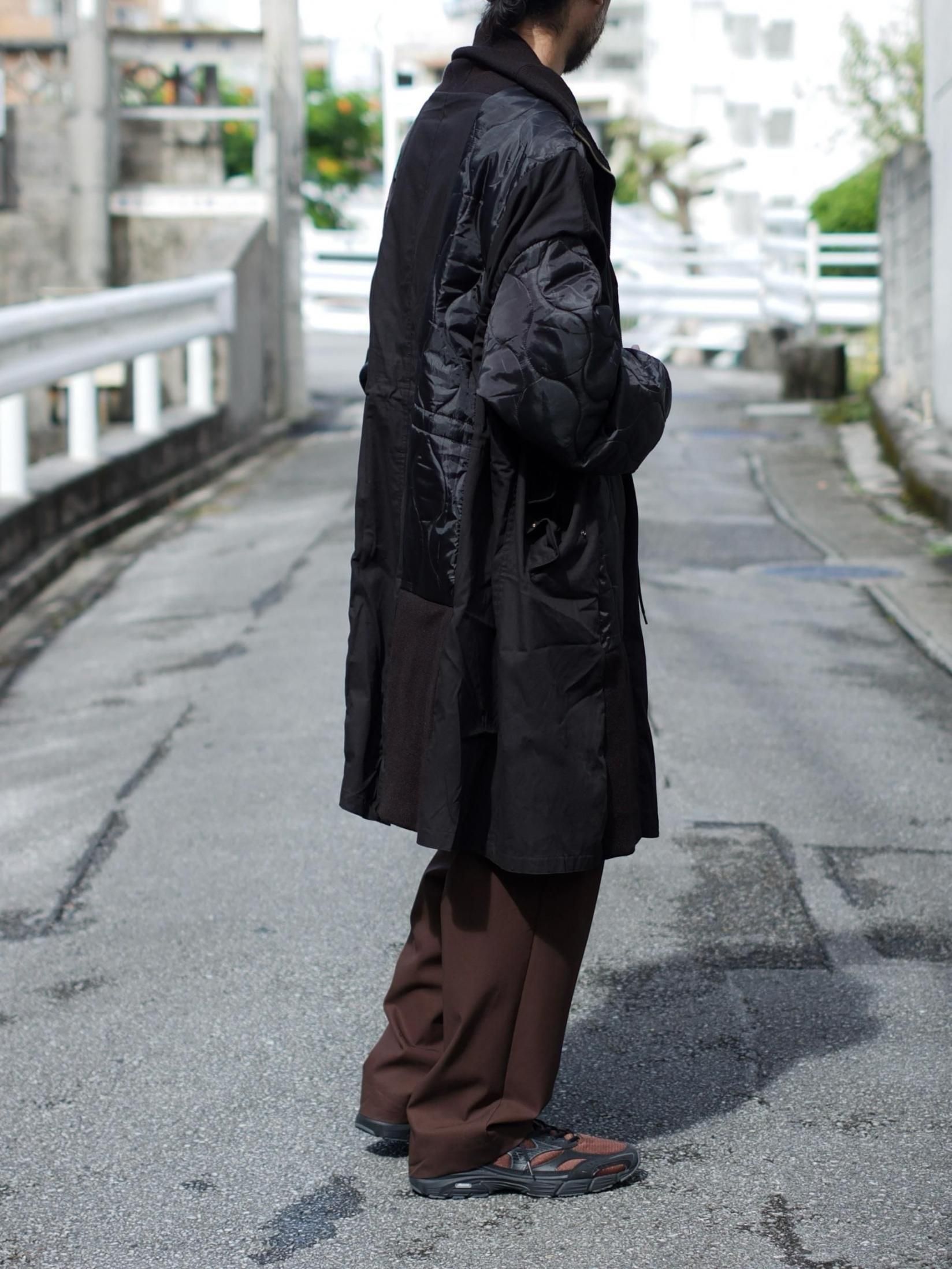 ・シェルを肩口から縦に裁断しライナーの身頃を縫製しワイドシルエットに、不足する着丈分裾に製品のリブを配し着丈を調整しつつアクセントに