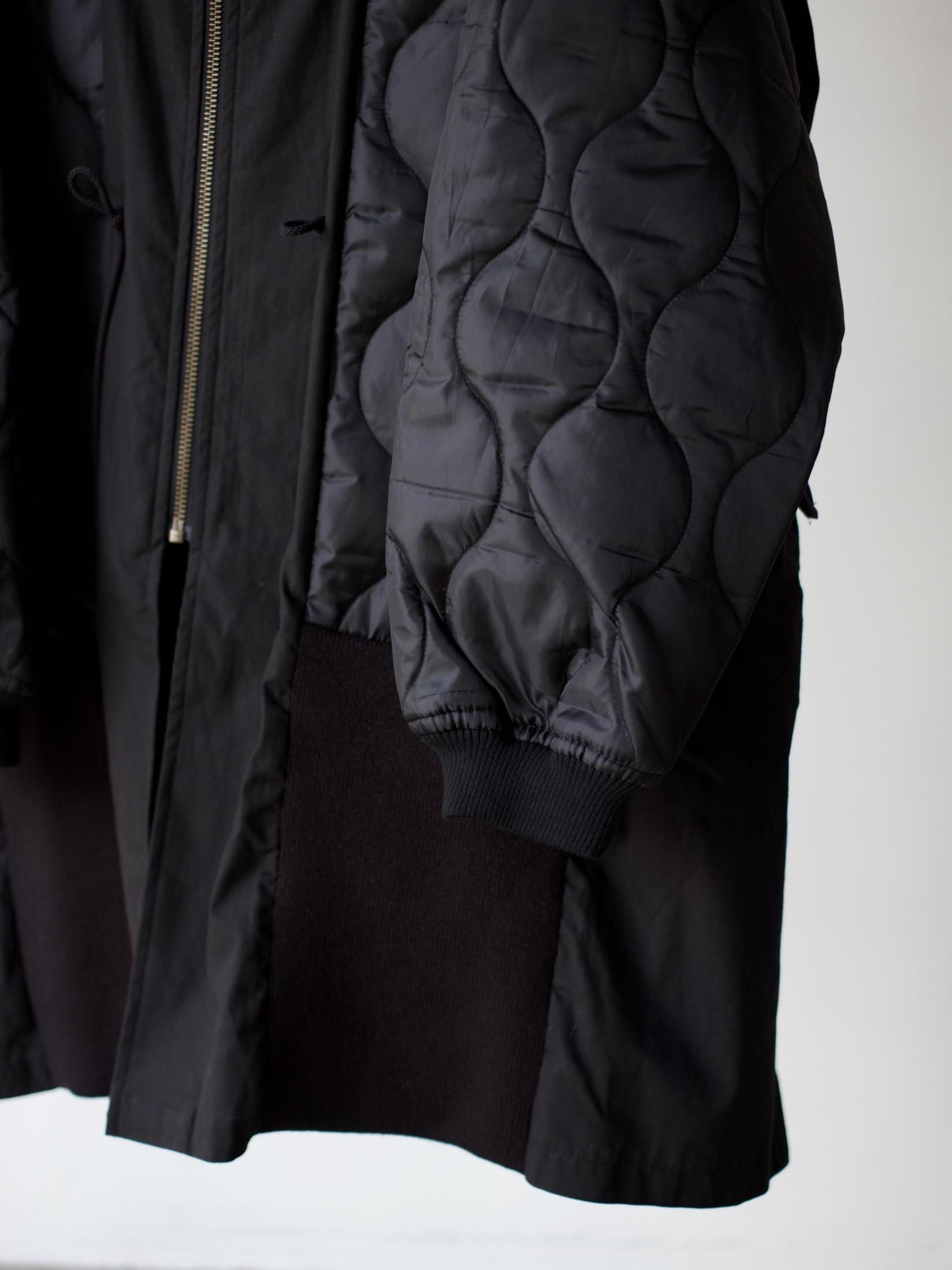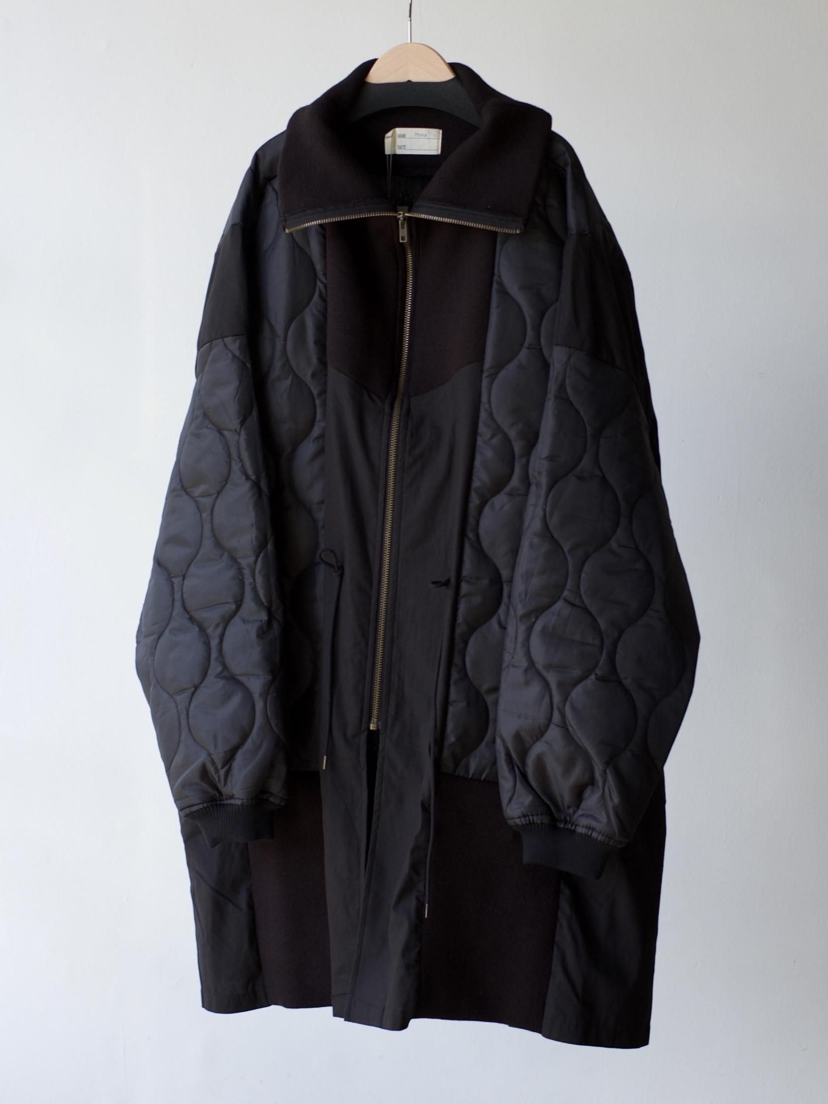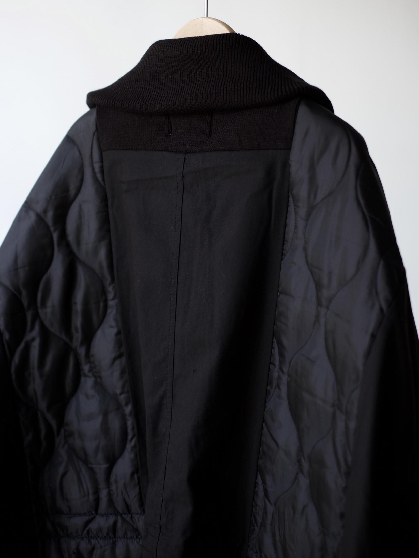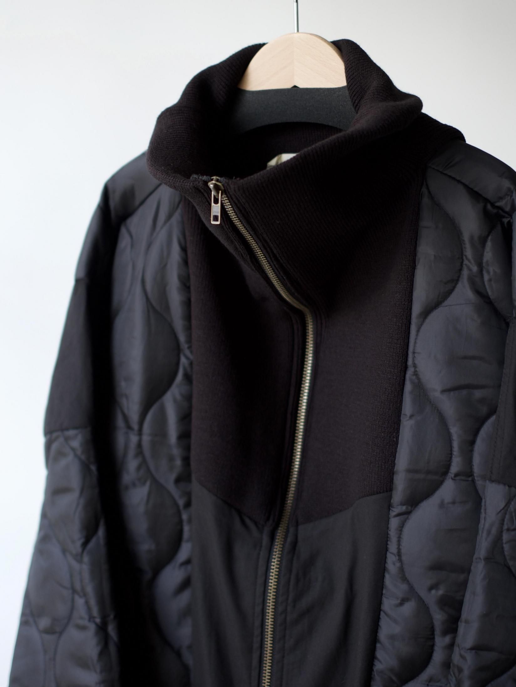 ・シェルを肩口から縦に裁断しライナーの身頃を縫製しワイドシルエットに、不足する着丈分裾に製品のリブを配し着丈を調整しつつアクセントに