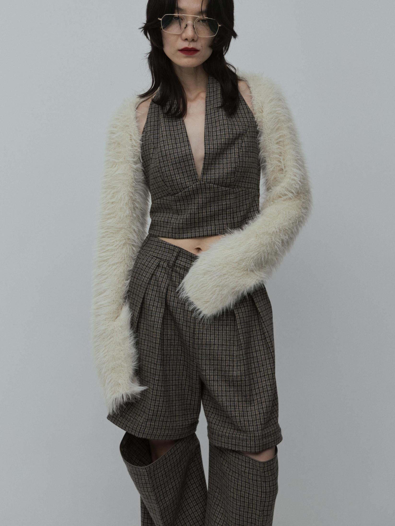 リムーバブルパンツと同じ反毛したリサイクルウールを使用したホルターベスト。