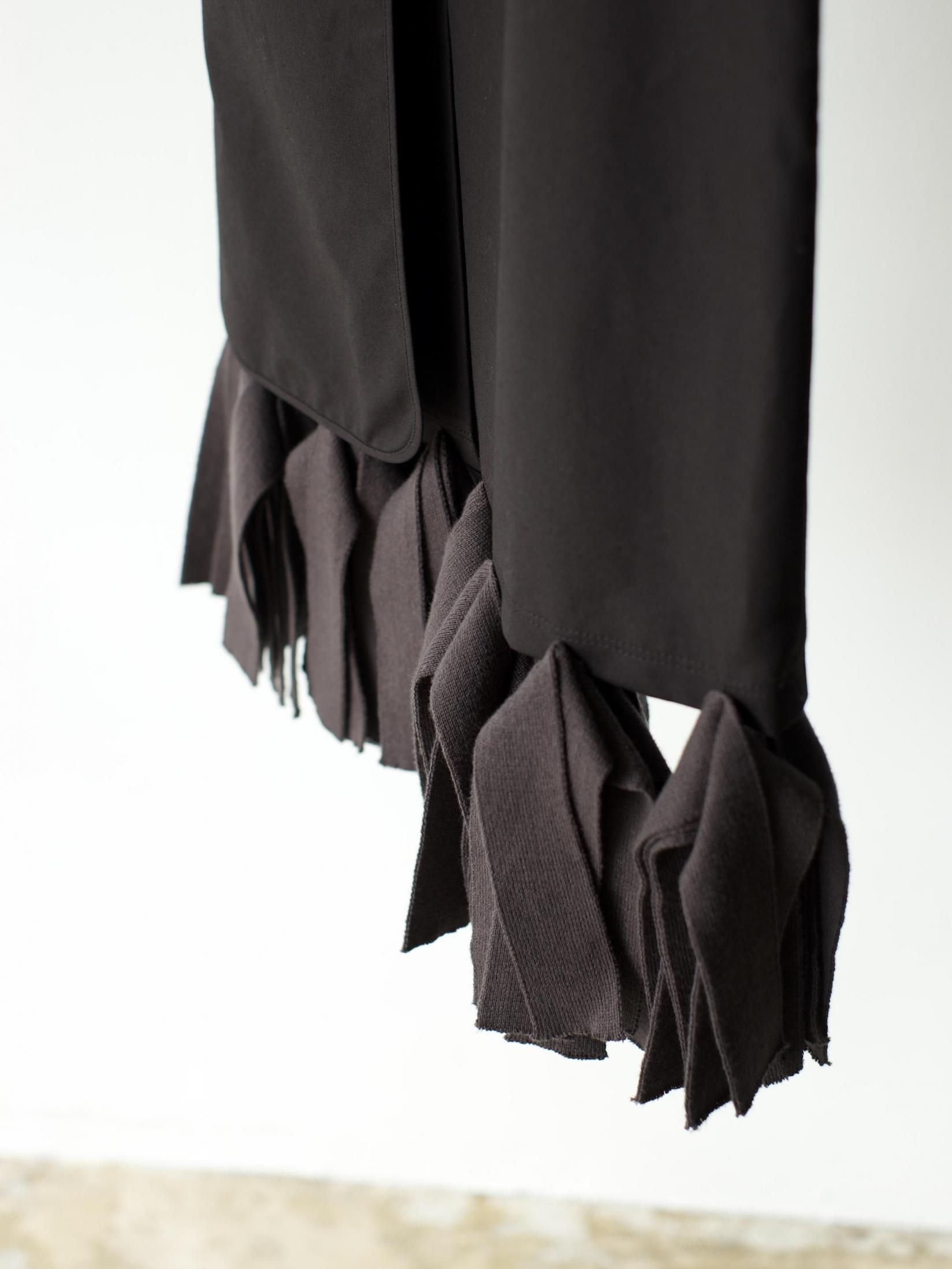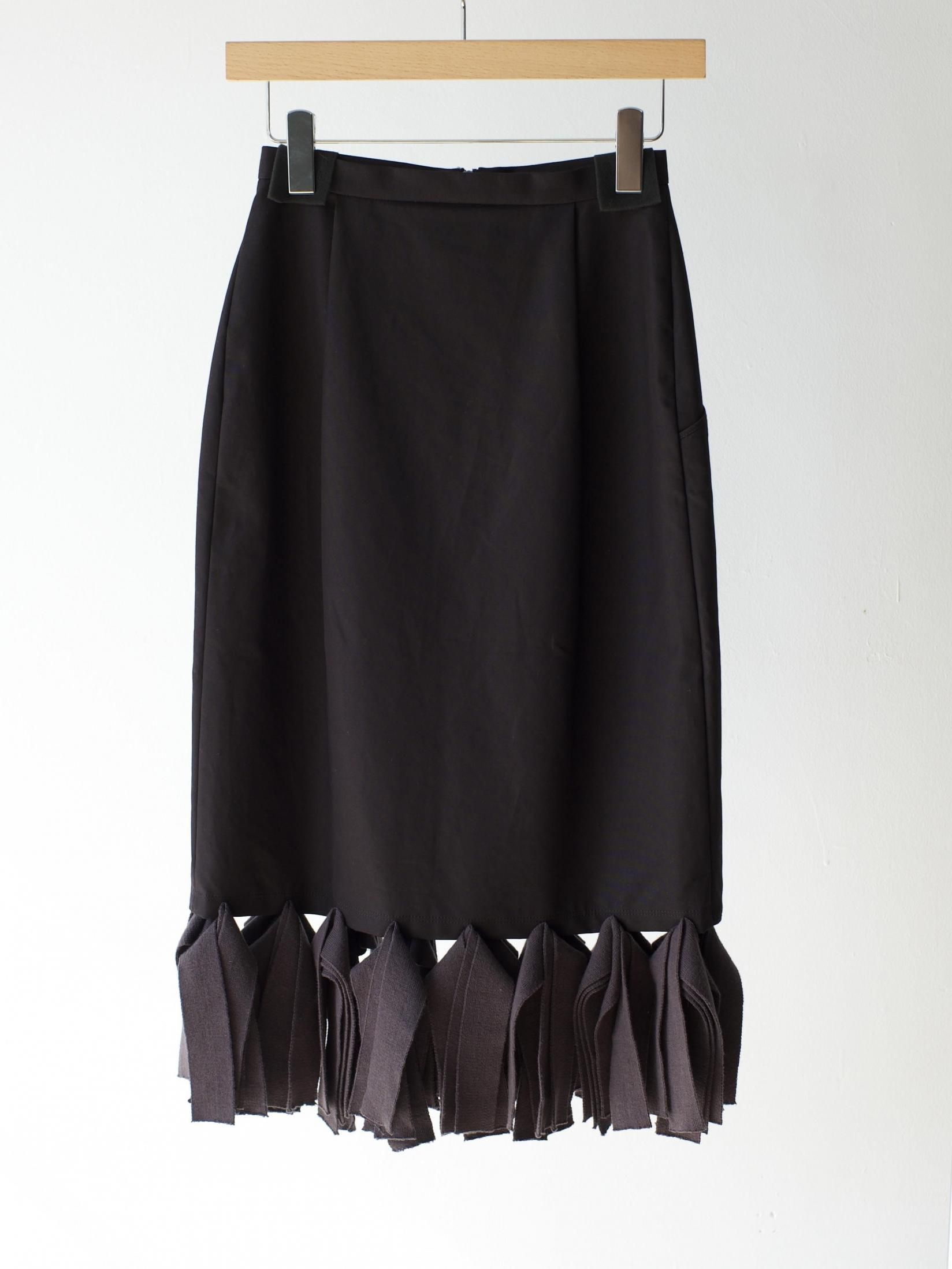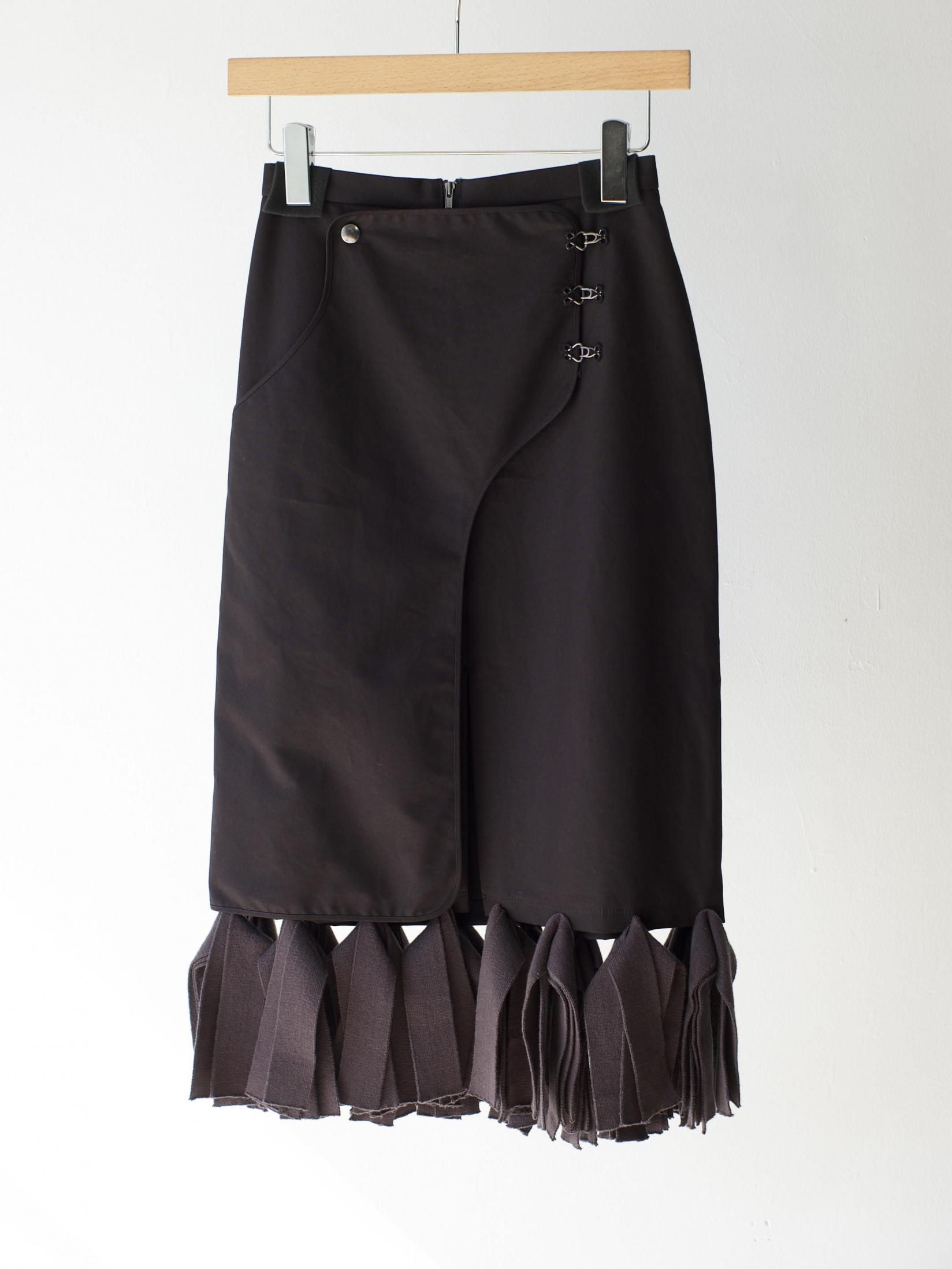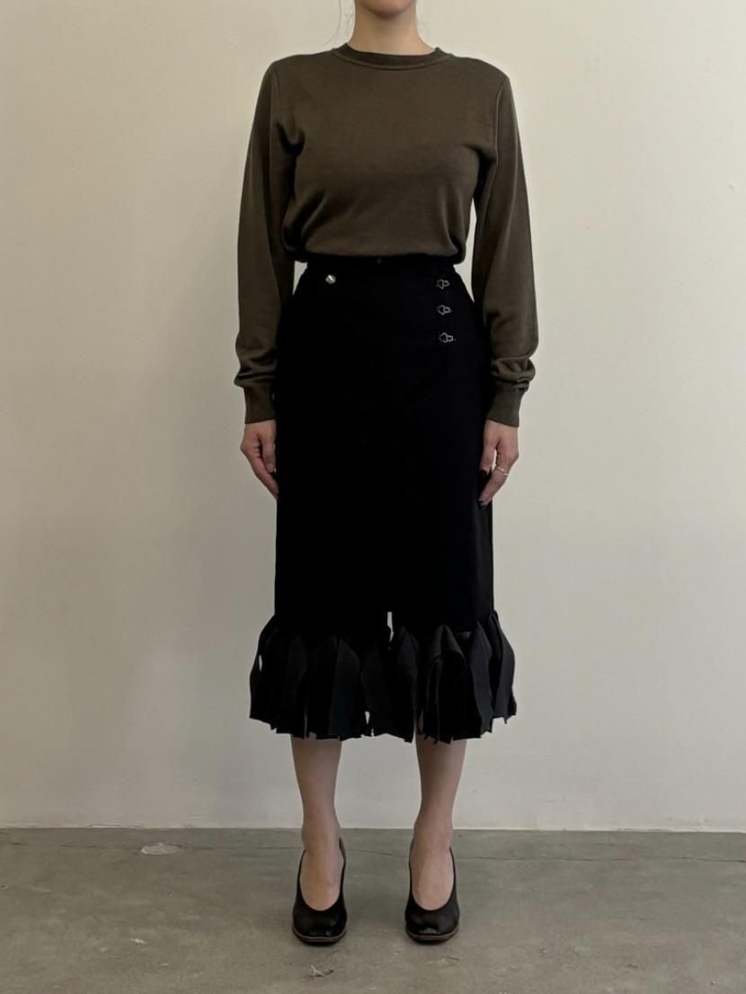 無骨さも感じるタフな生地と繊細なニットフリンジが特徴のスカート。