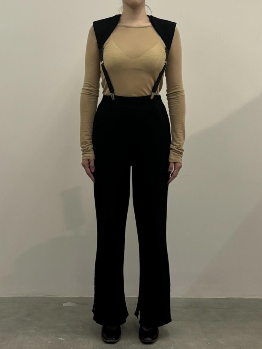ニットとサテンで包み込んだ肩パッド付きサスペンダー。