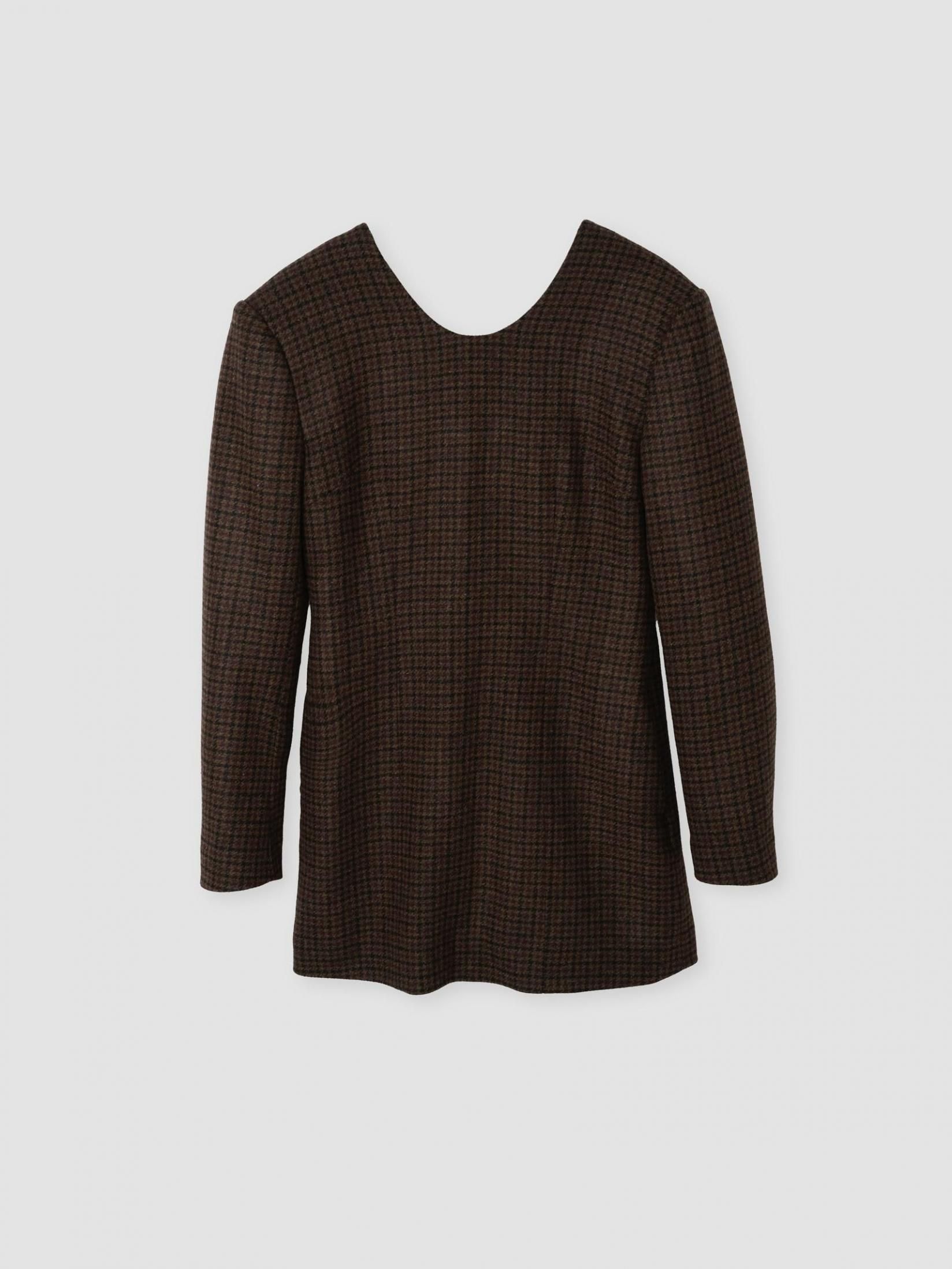 ラウンドネックプルオーバーチュニックワンピースです。薄手の肩パッドを入れ、ウエストをシェイプした構築的なデザインです。両サイドは切り替え利用のポケットあり。