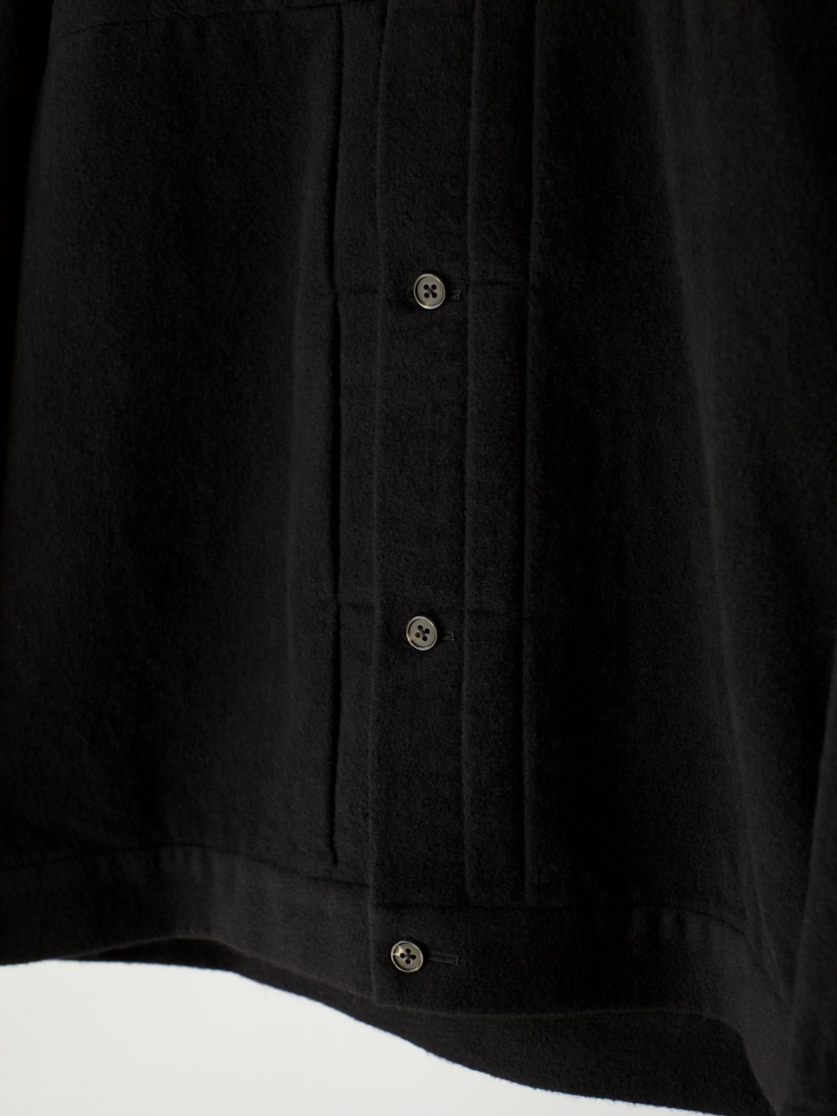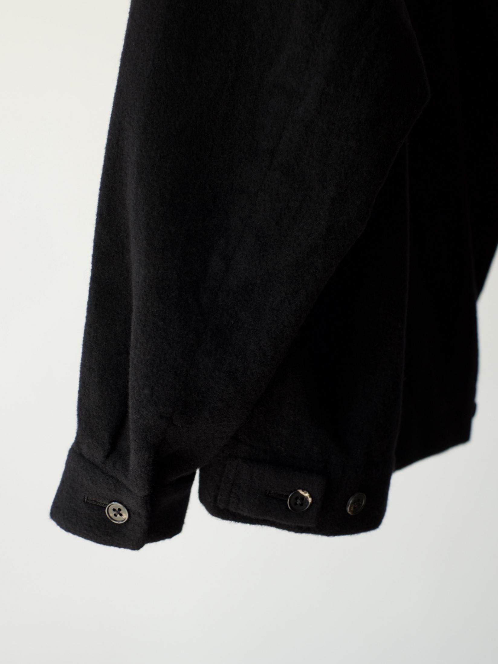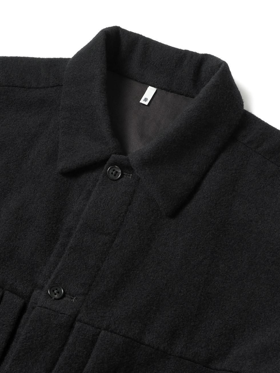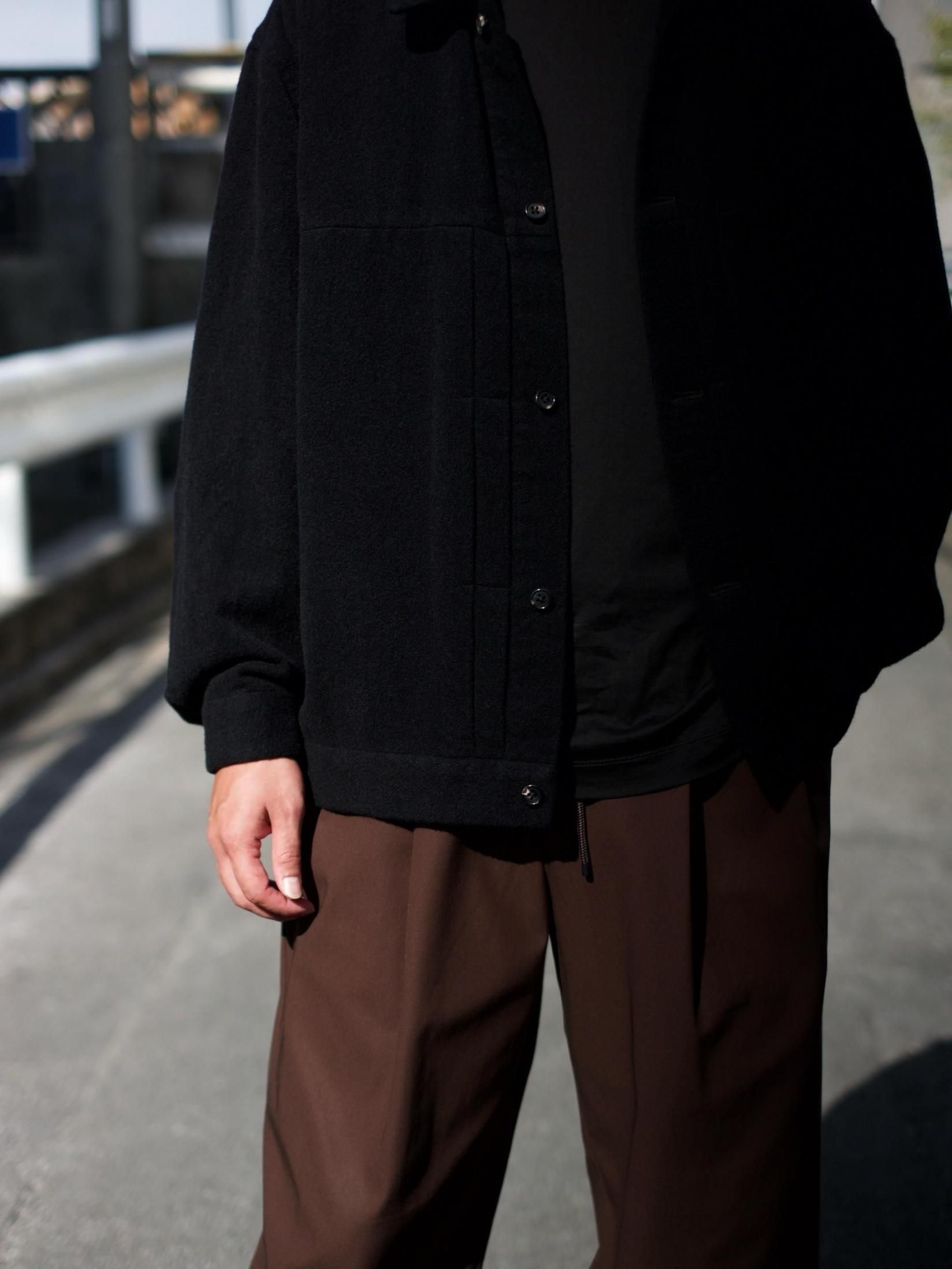 ニット用に紡績された紡毛カシミヤに甘く撚りをかけて生地に仕立て、さらにニット用の縮絨加工を施すことで、布帛でありながらニットのような柔らかさと膨らみを実現した極上のシャツジャケット。