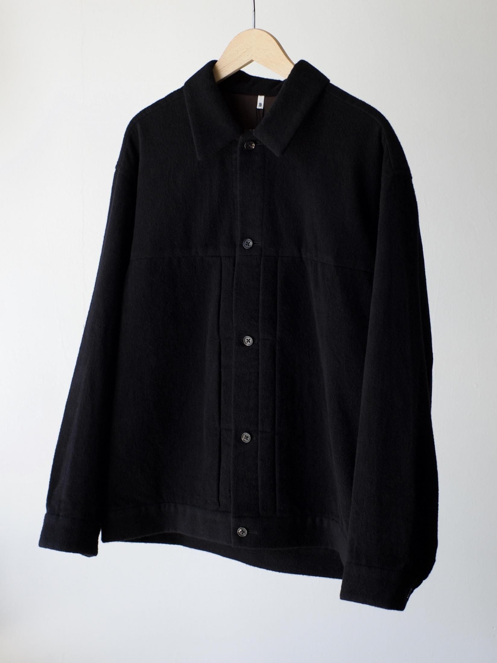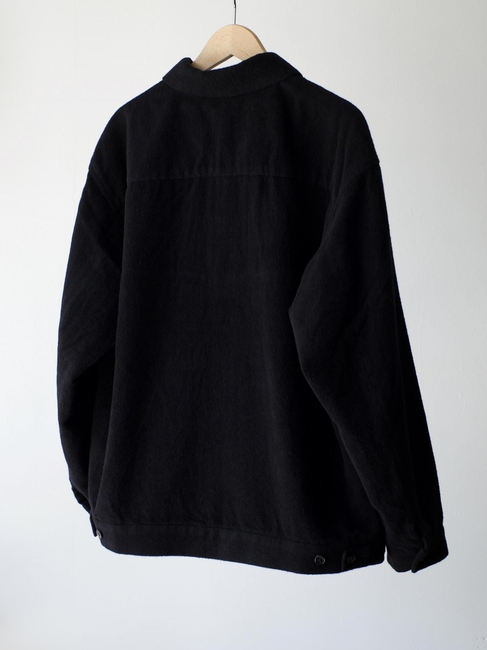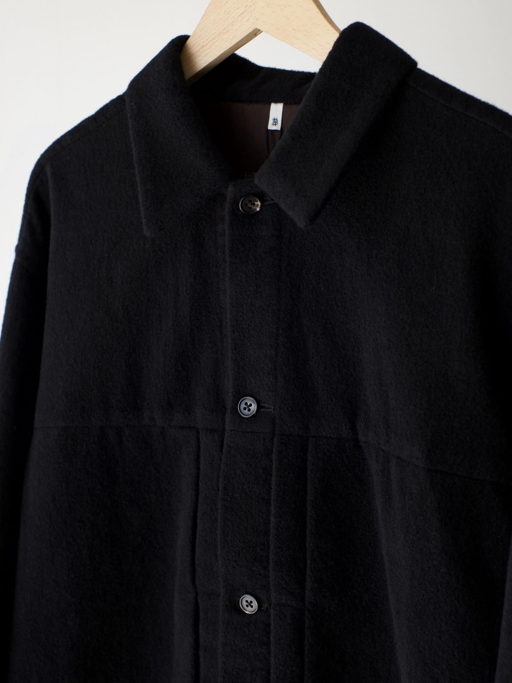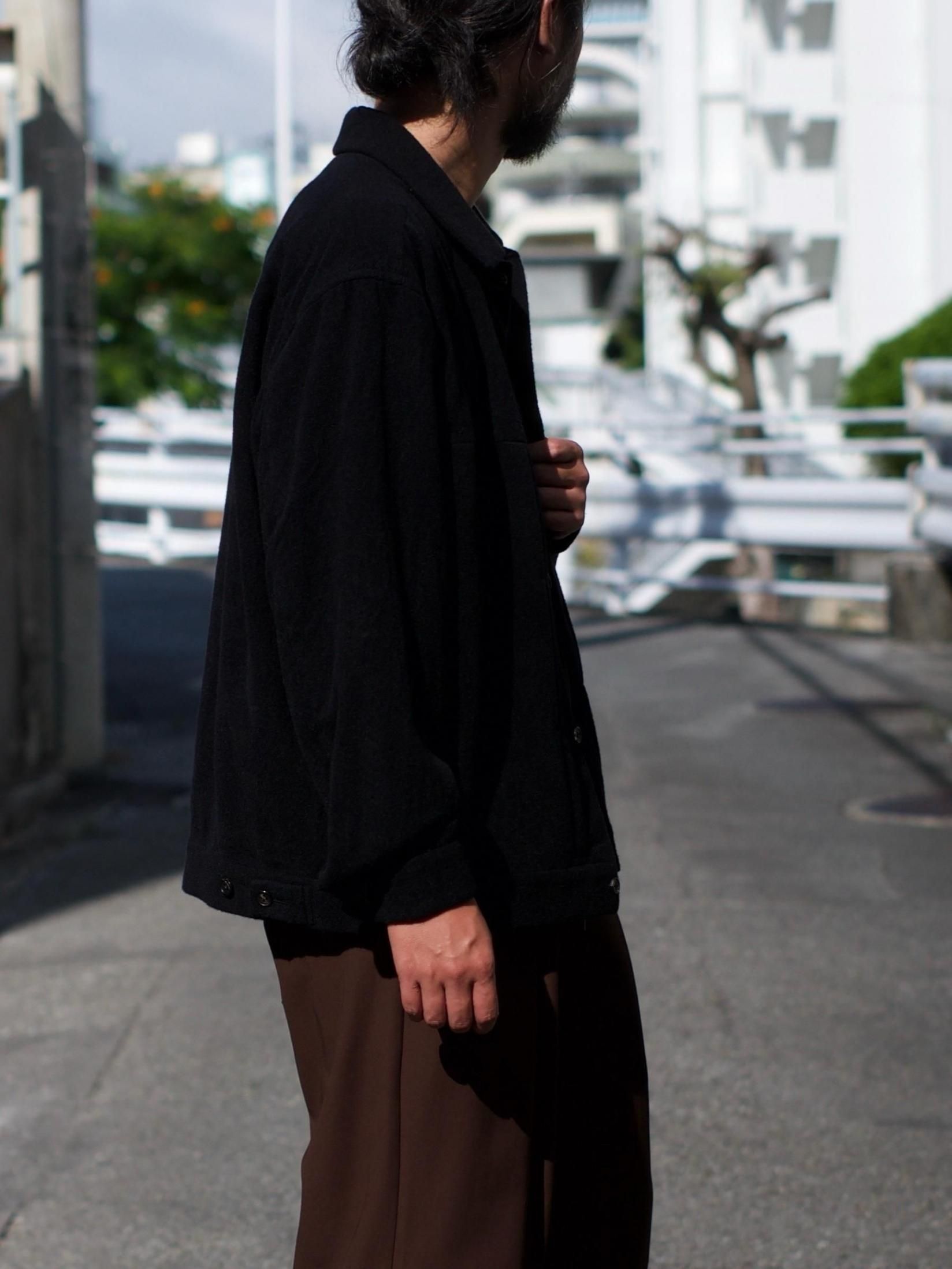 ニット用に紡績された紡毛カシミヤに甘く撚りをかけて生地に仕立て、さらにニット用の縮絨加工を施すことで、布帛でありながらニットのような柔らかさと膨らみを実現した極上のシャツジャケット。
