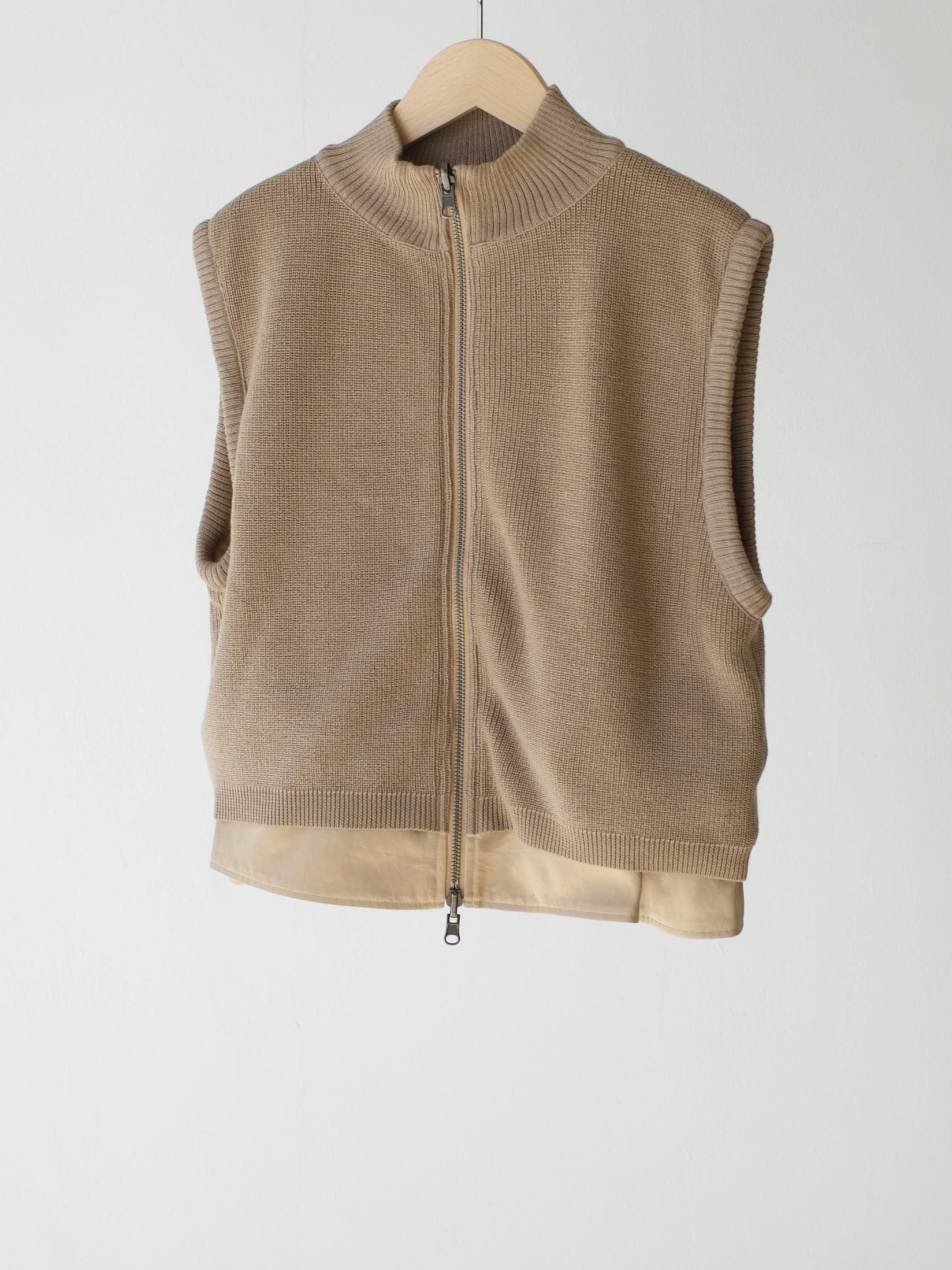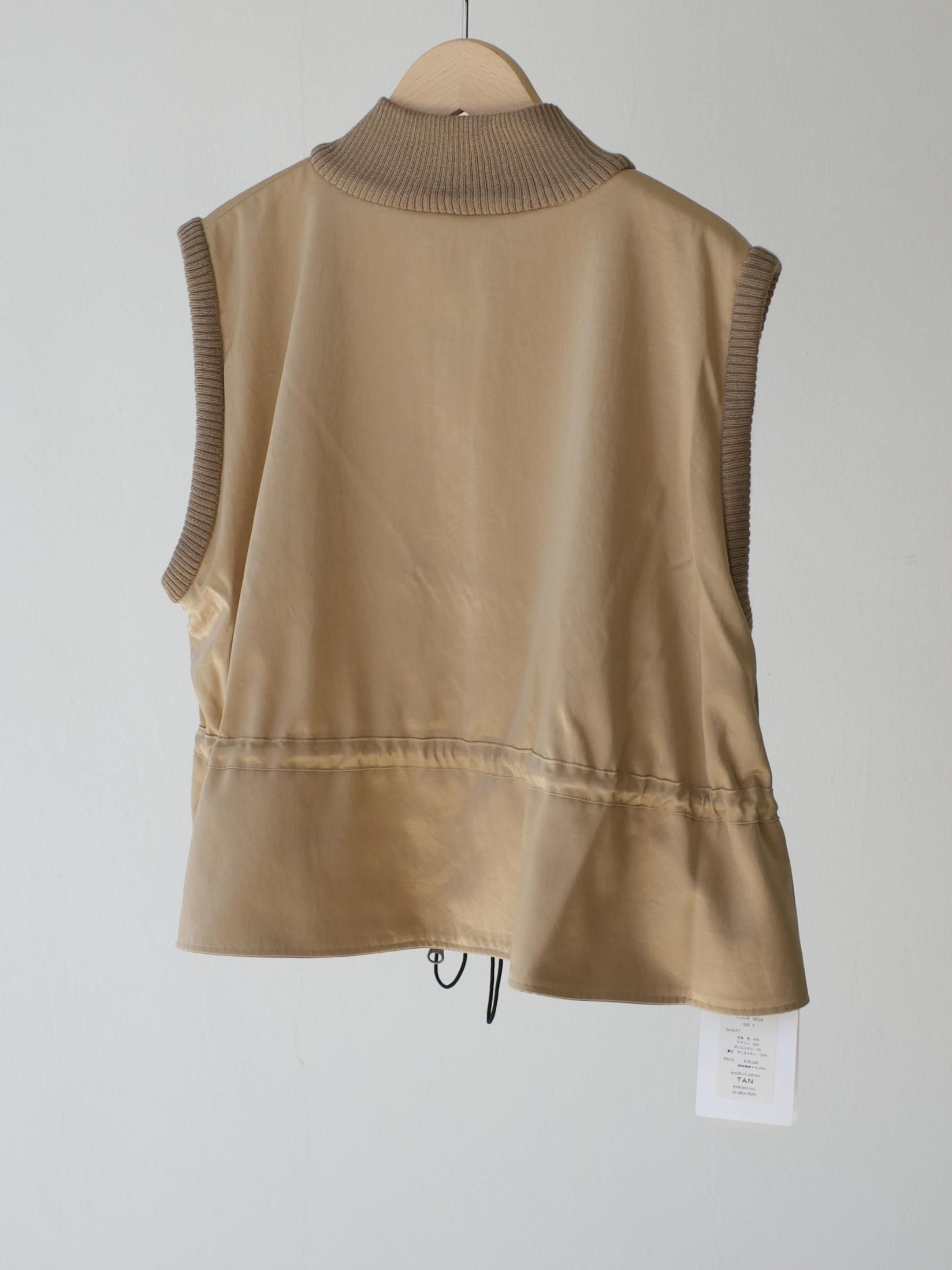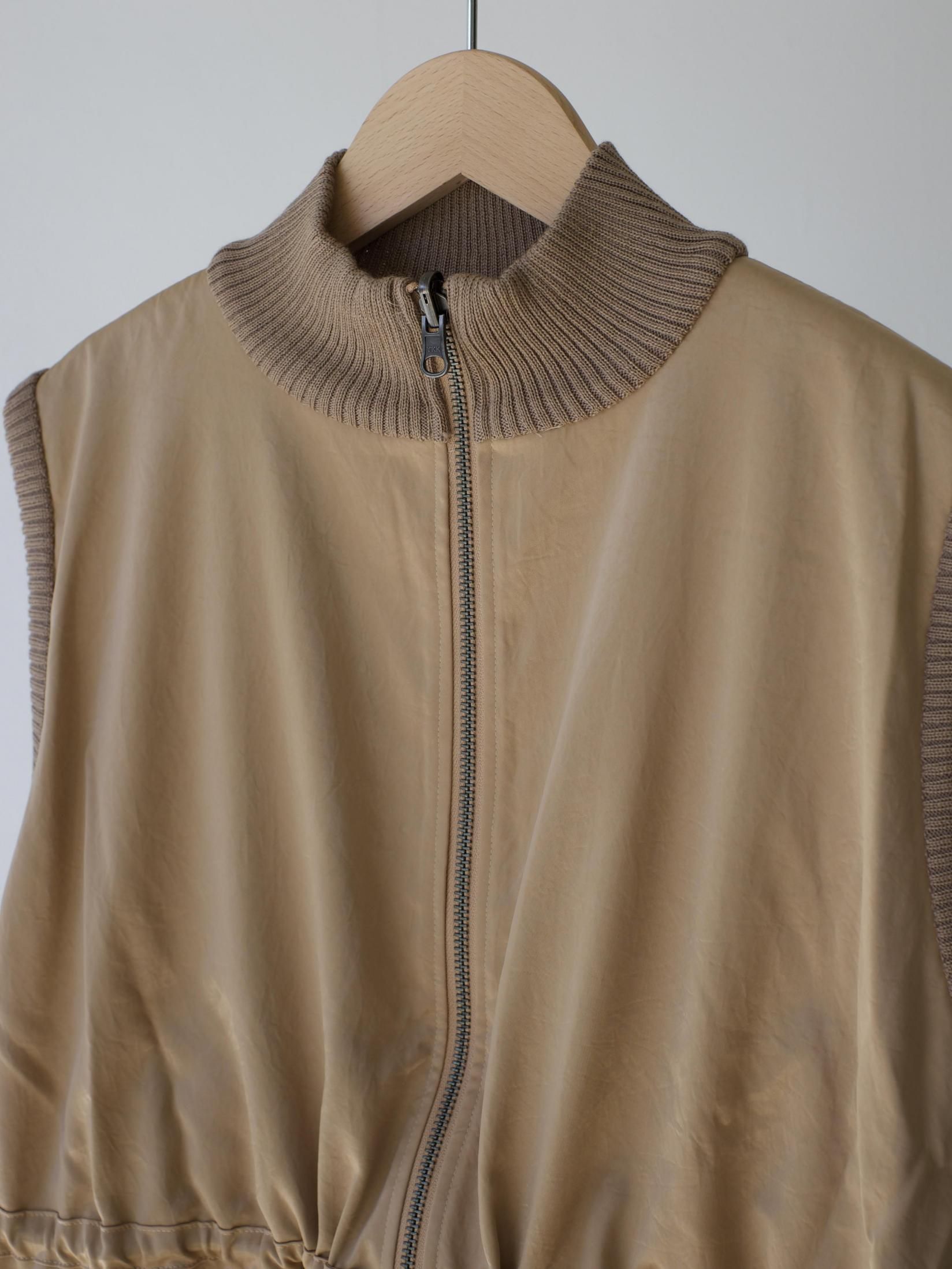 レザーのような艶を放つサテン生地と、柔らかなリブテキスタイルのリバーシブルデザイン。逆開ファスナー仕様で、スタイリングの幅が広がるベスト。