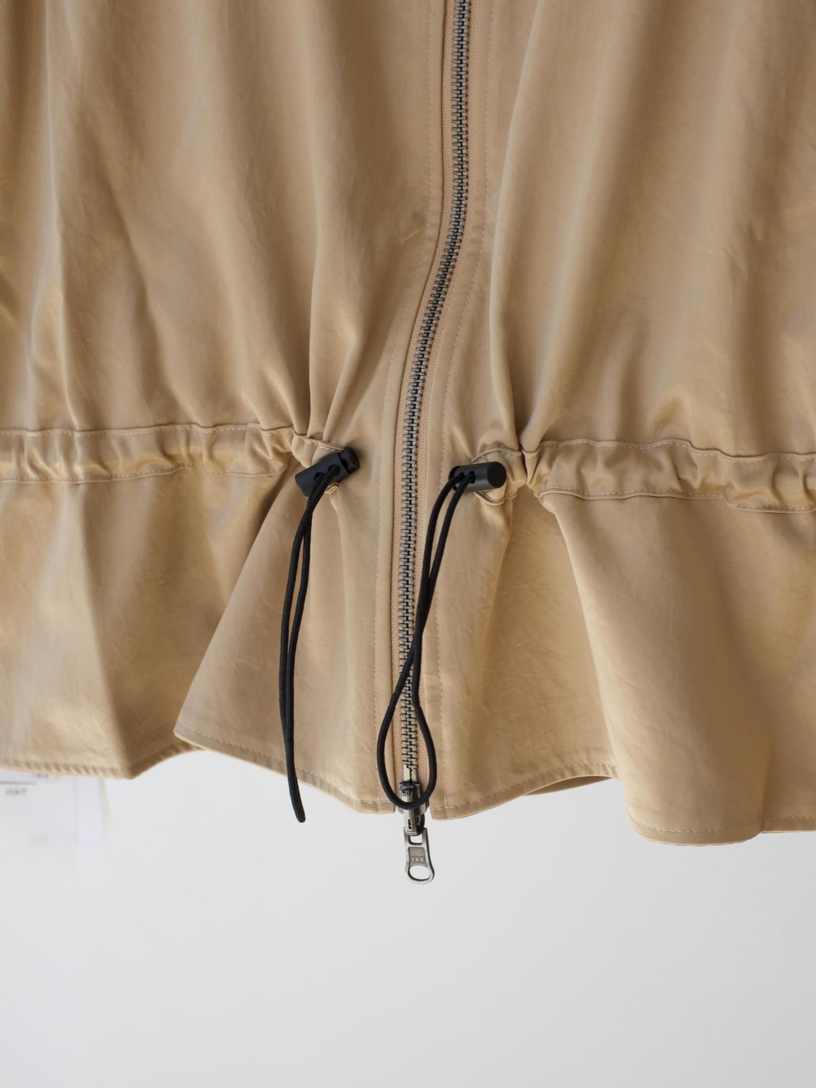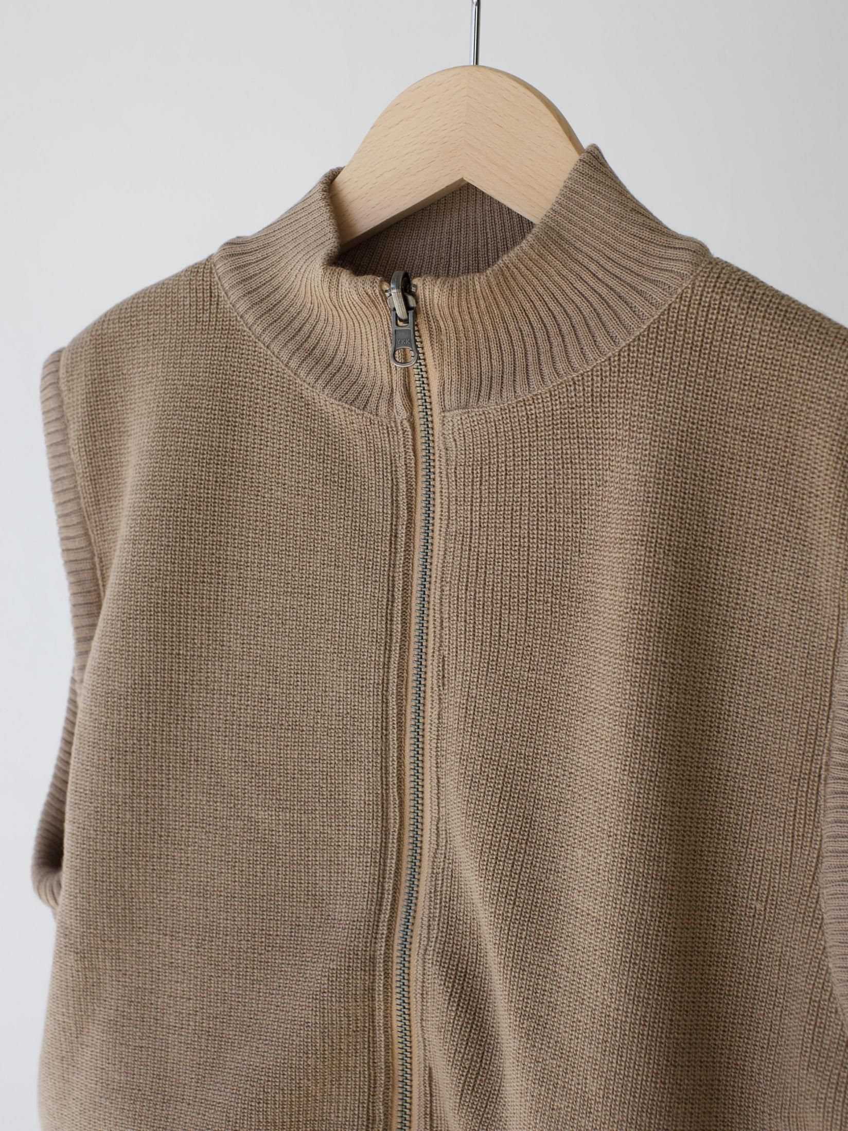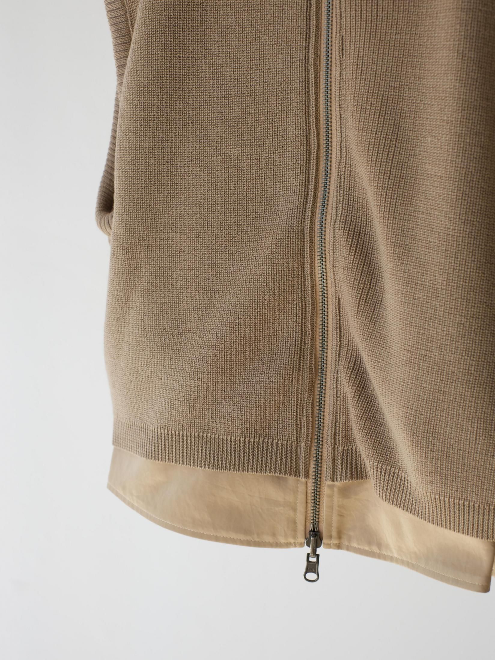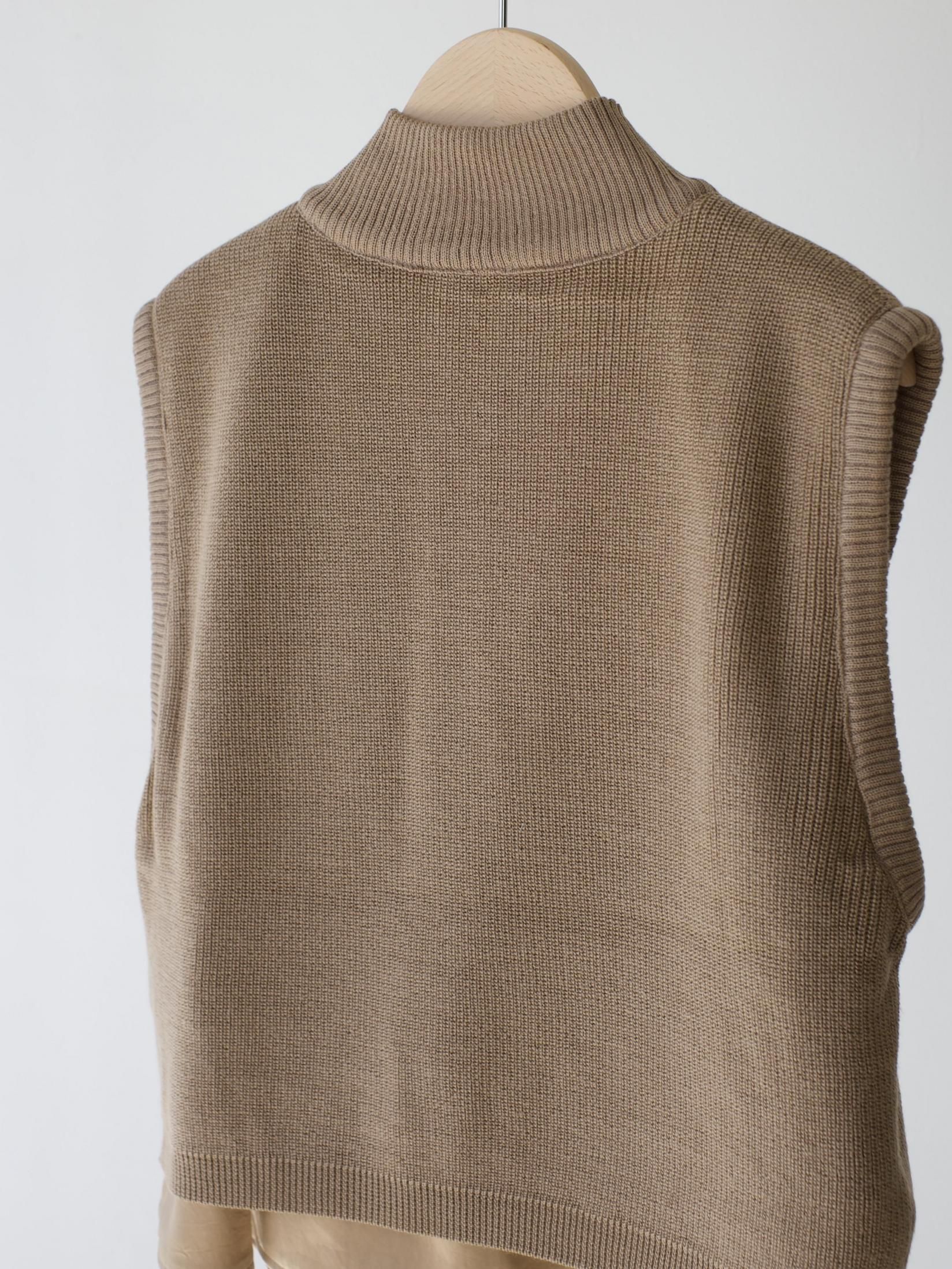 レザーのような艶を放つサテン生地と、柔らかなリブテキスタイルのリバーシブルデザイン。逆開ファスナー仕様で、スタイリングの幅が広がるベスト。