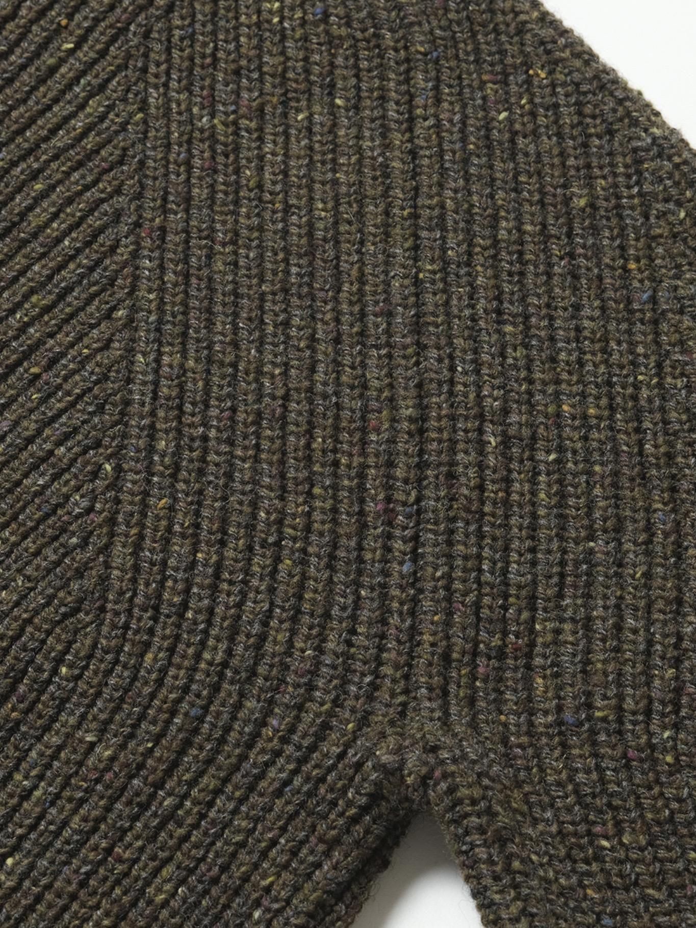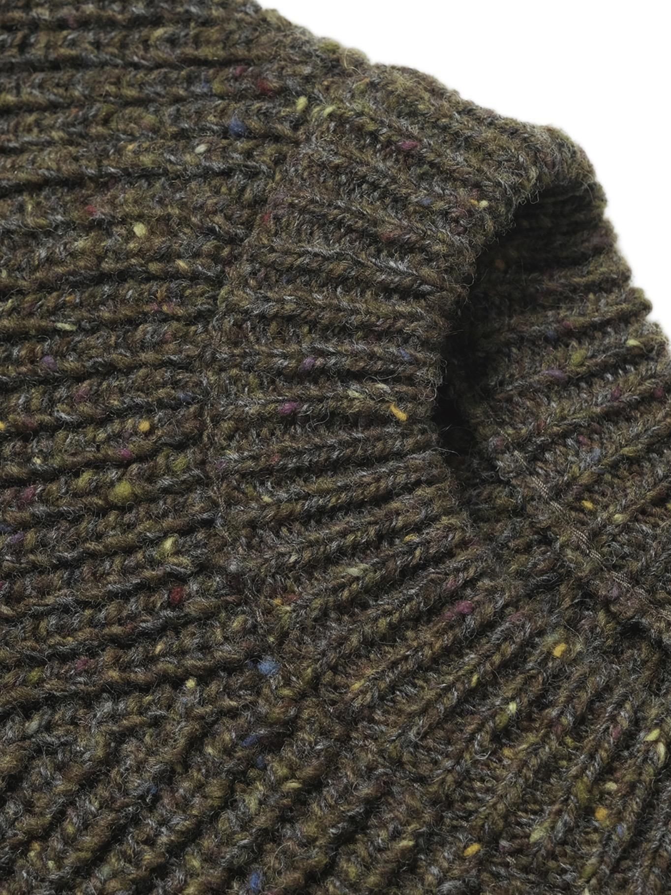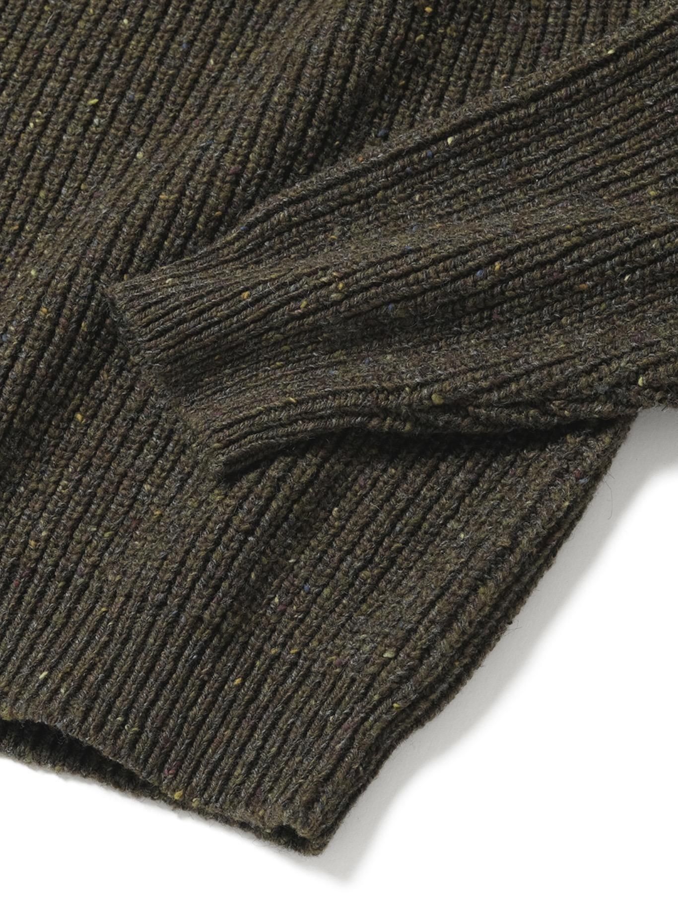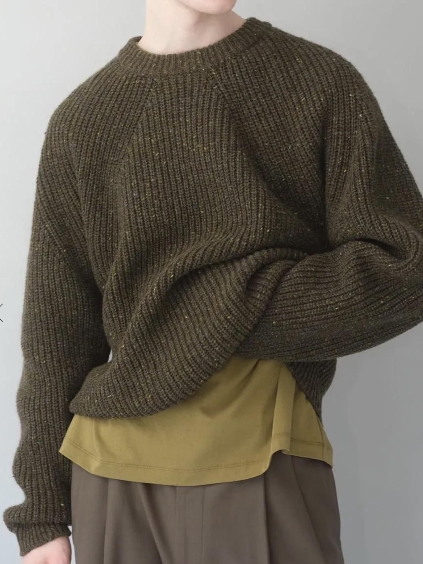 トラッドな雰囲気を持つシェットランドウールにアルパカを撚糸し、ツイード調に編み立てたほのかに起毛感のアイテム。
