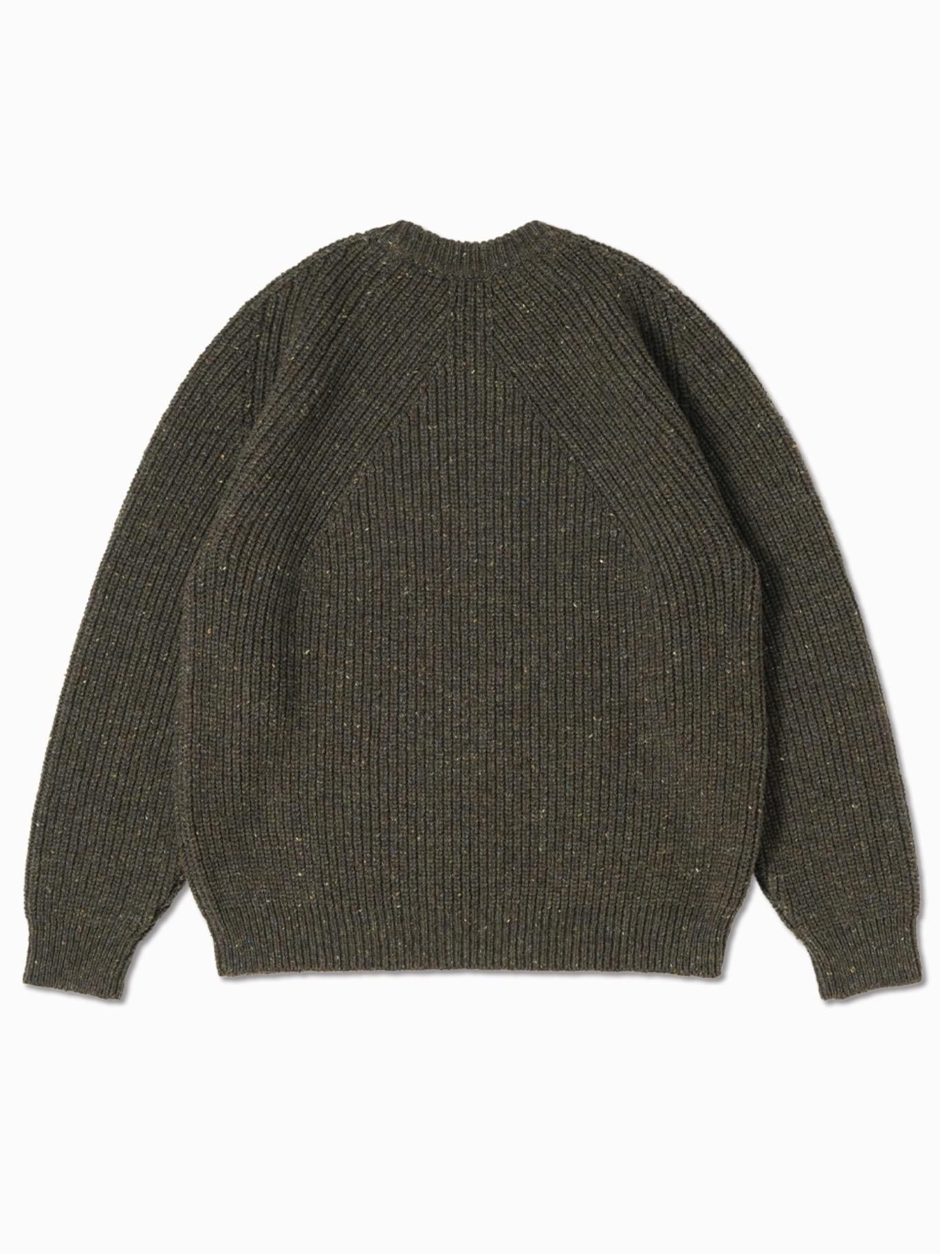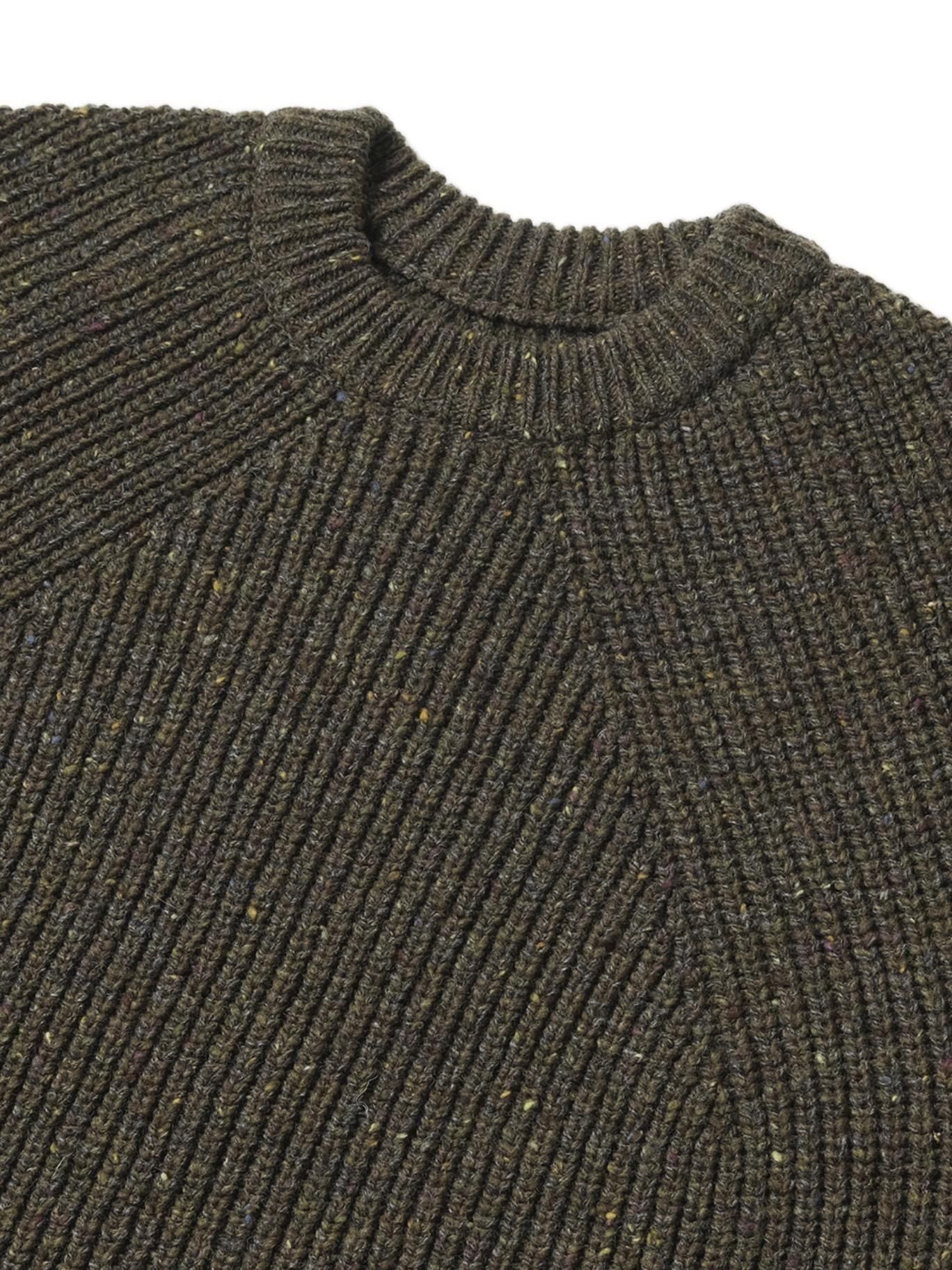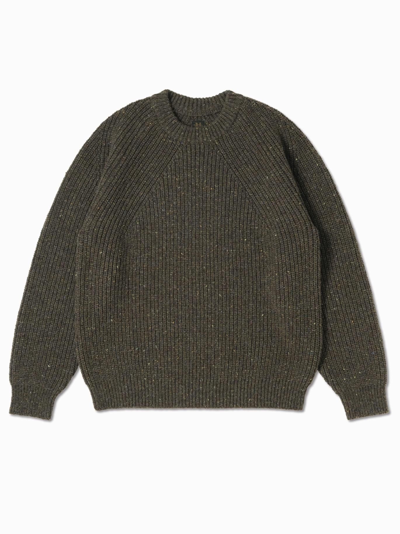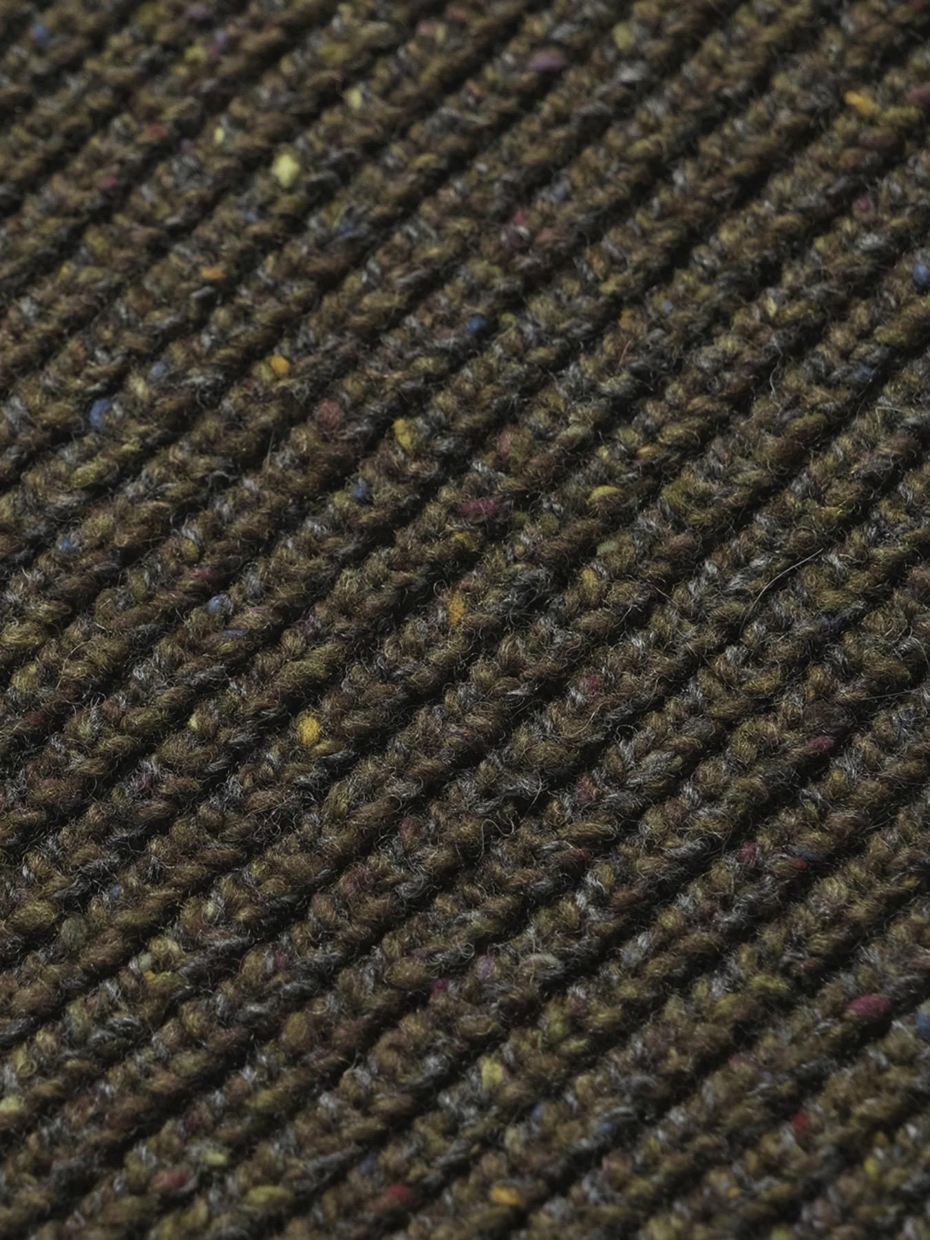 トラッドな雰囲気を持つシェットランドウールにアルパカを撚糸し、ツイード調に編み立てたほのかに起毛感のアイテム。