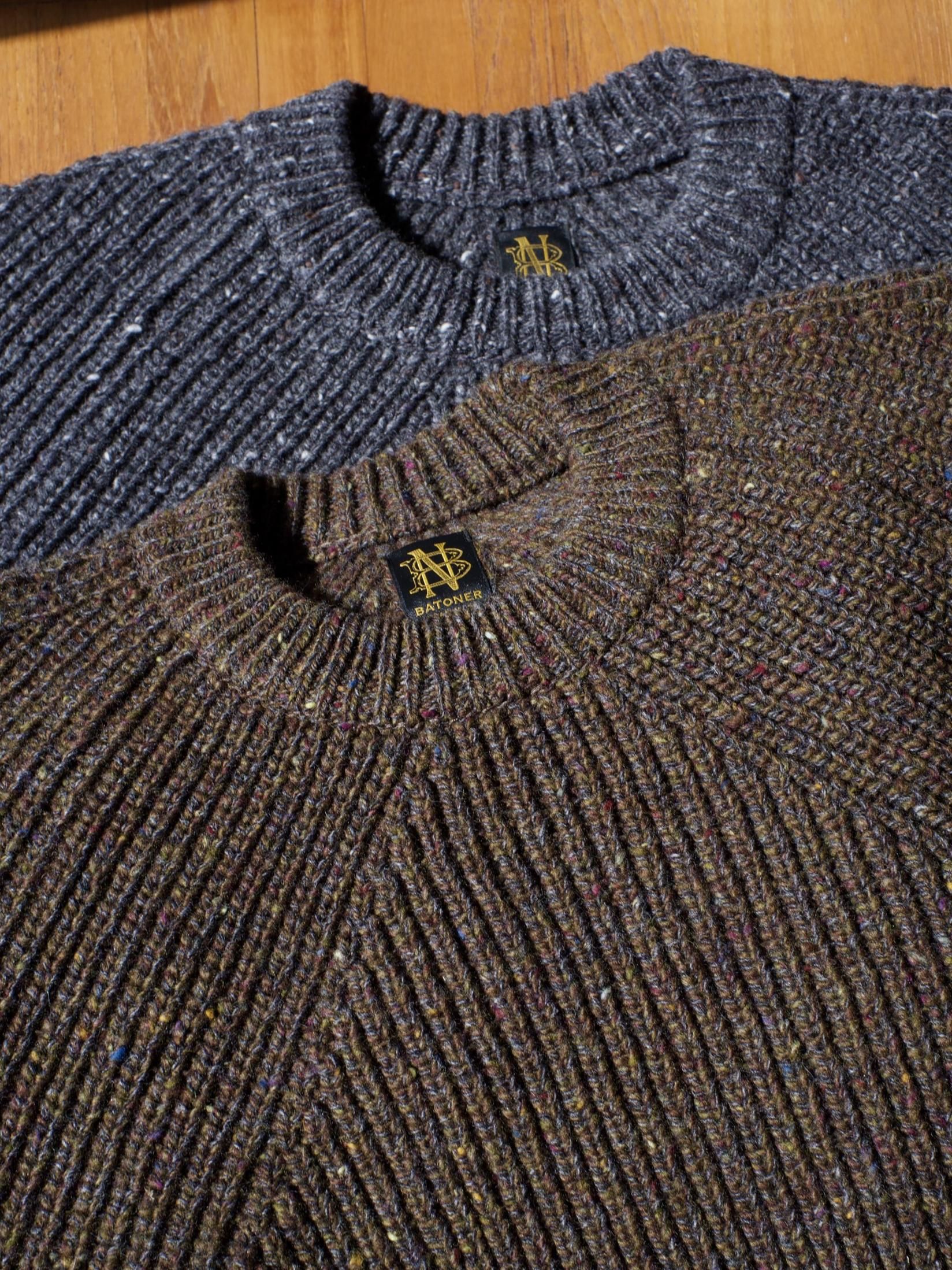 BATONERの象徴的な編み柄が特徴で、定番のSOLID WOOL SIGNATUREとは素材構成の異なる一枚です。