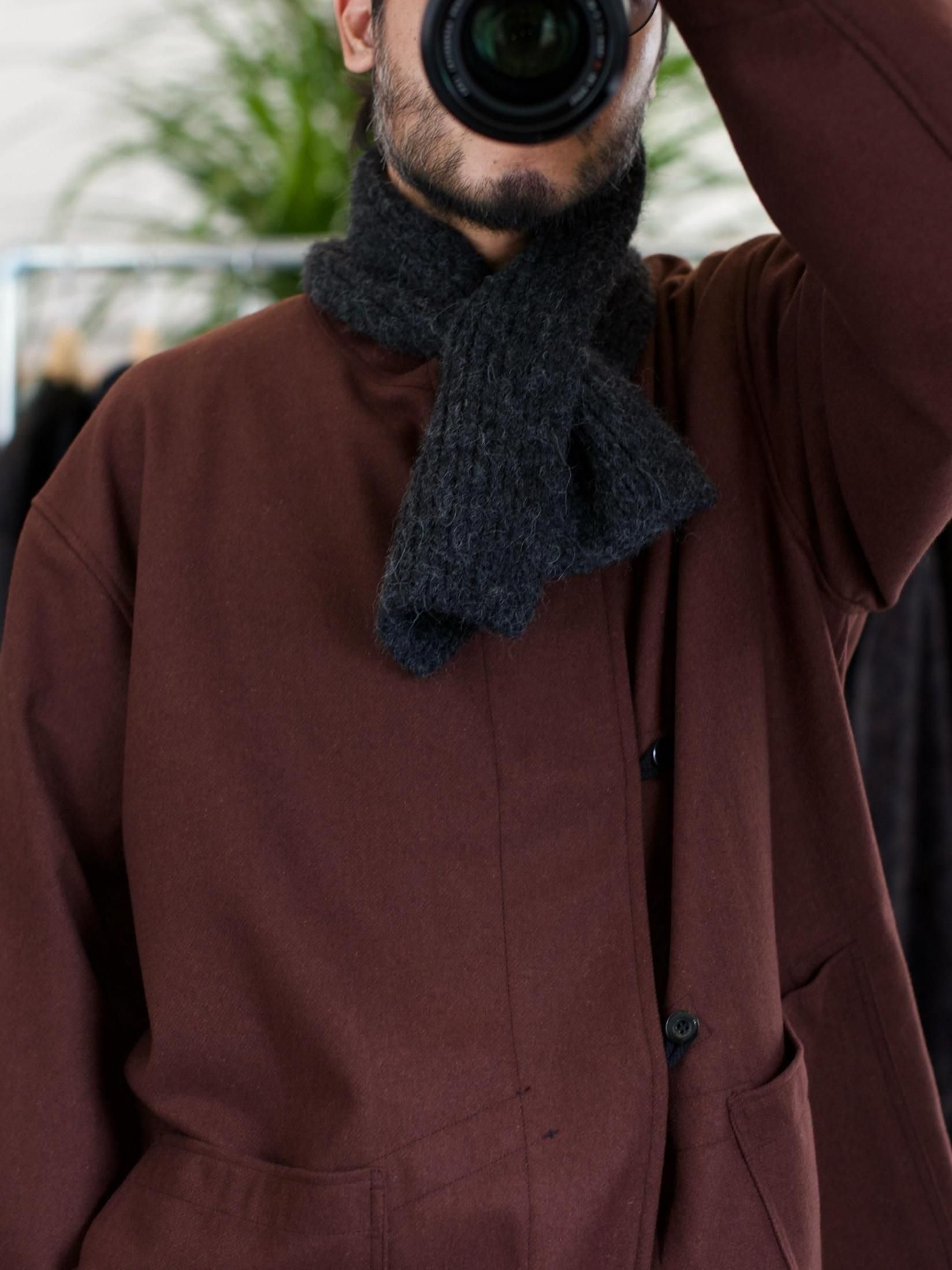 柔らかな風合いを持つファインアルパカに、メリノウールを芯にした起毛糸を多本取りし、ローゲージで編み立て、糸そのものが持つ膨らみにより独特の立体感が特徴のマフラー。