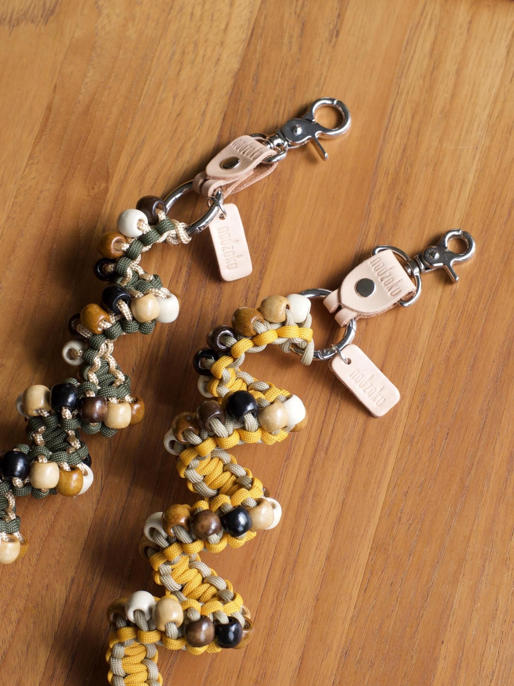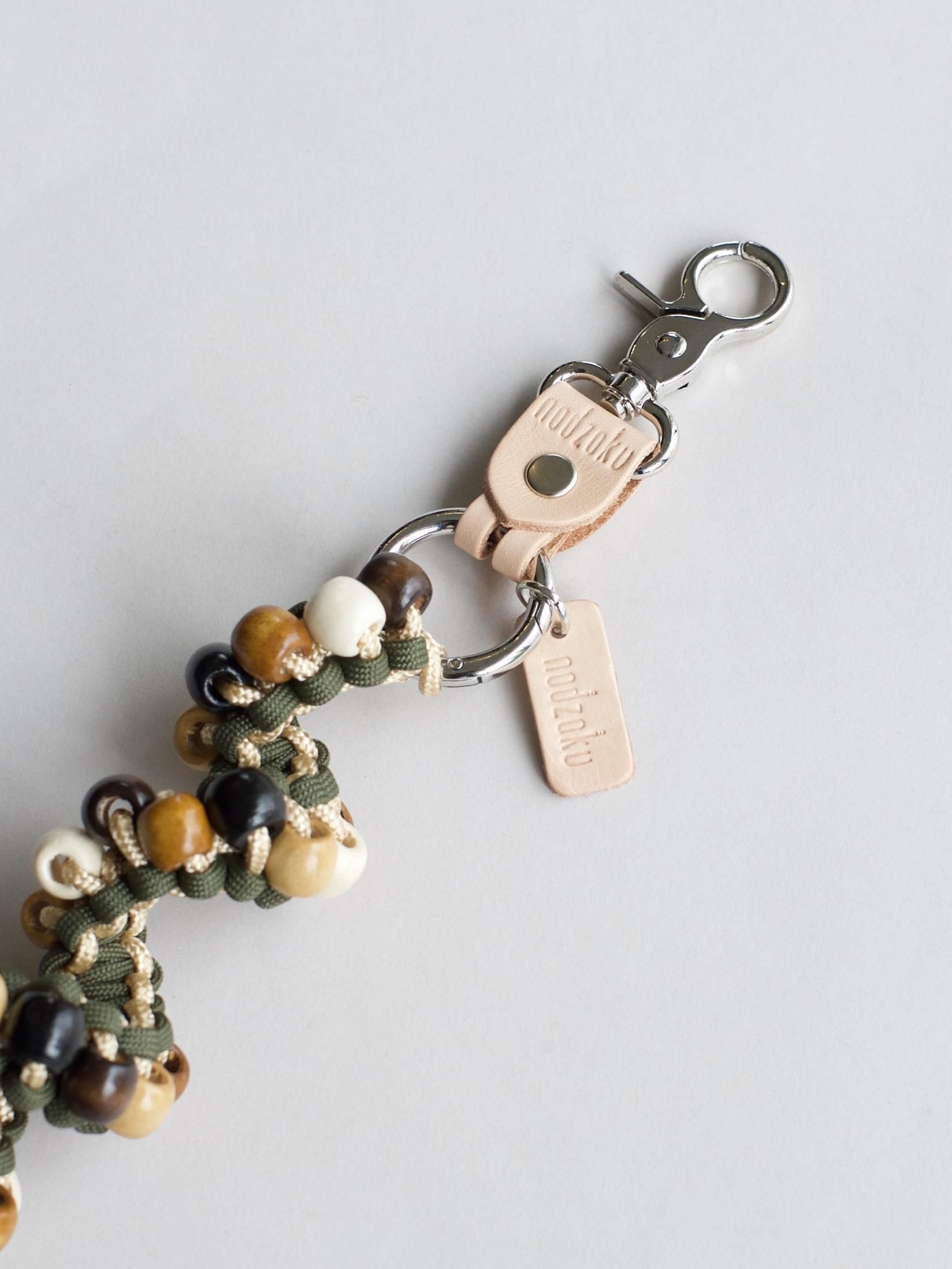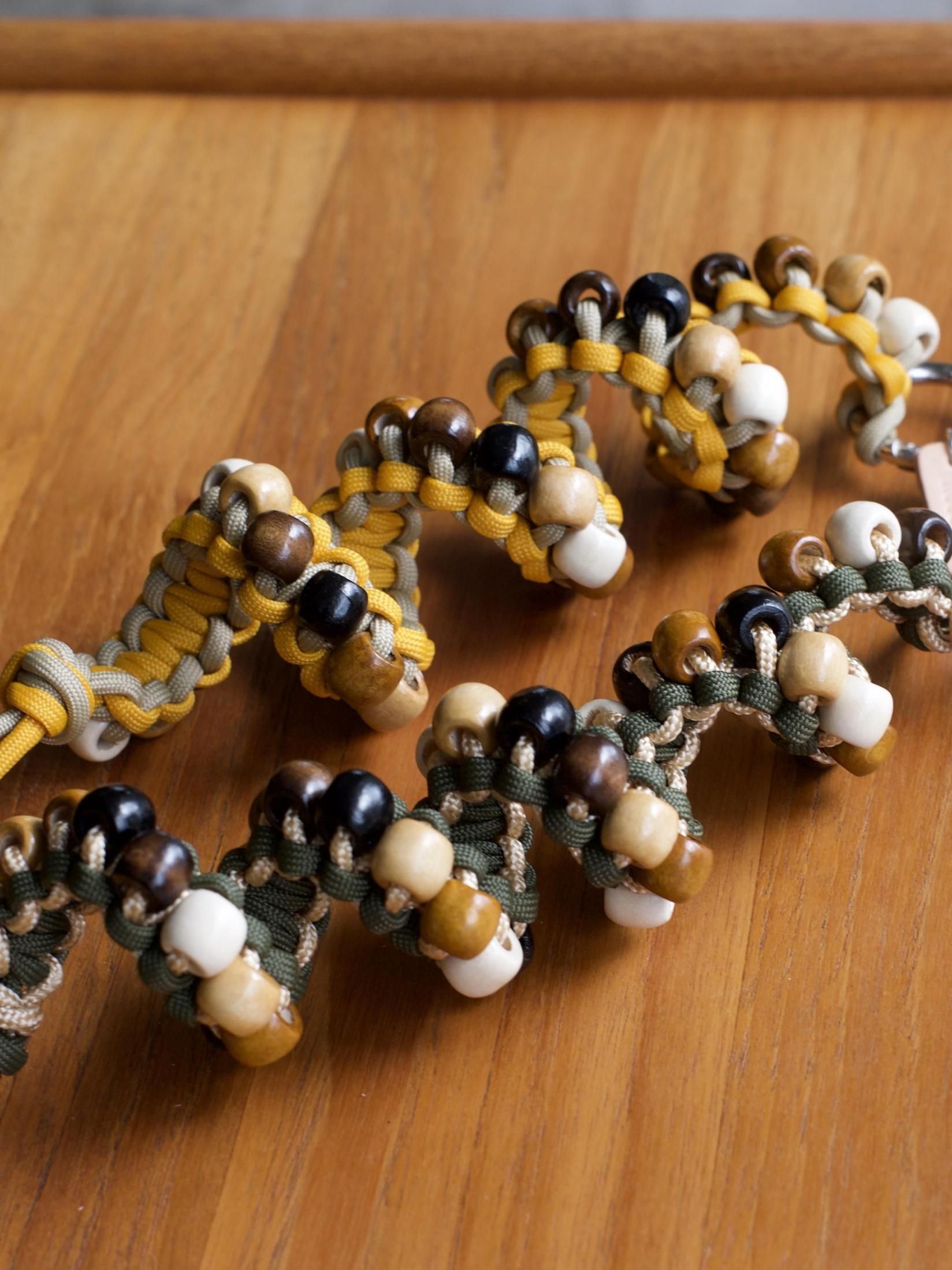 パラコード×木製ビーズ×レザーパーツの3つをミックスしたアクセサリーです。
