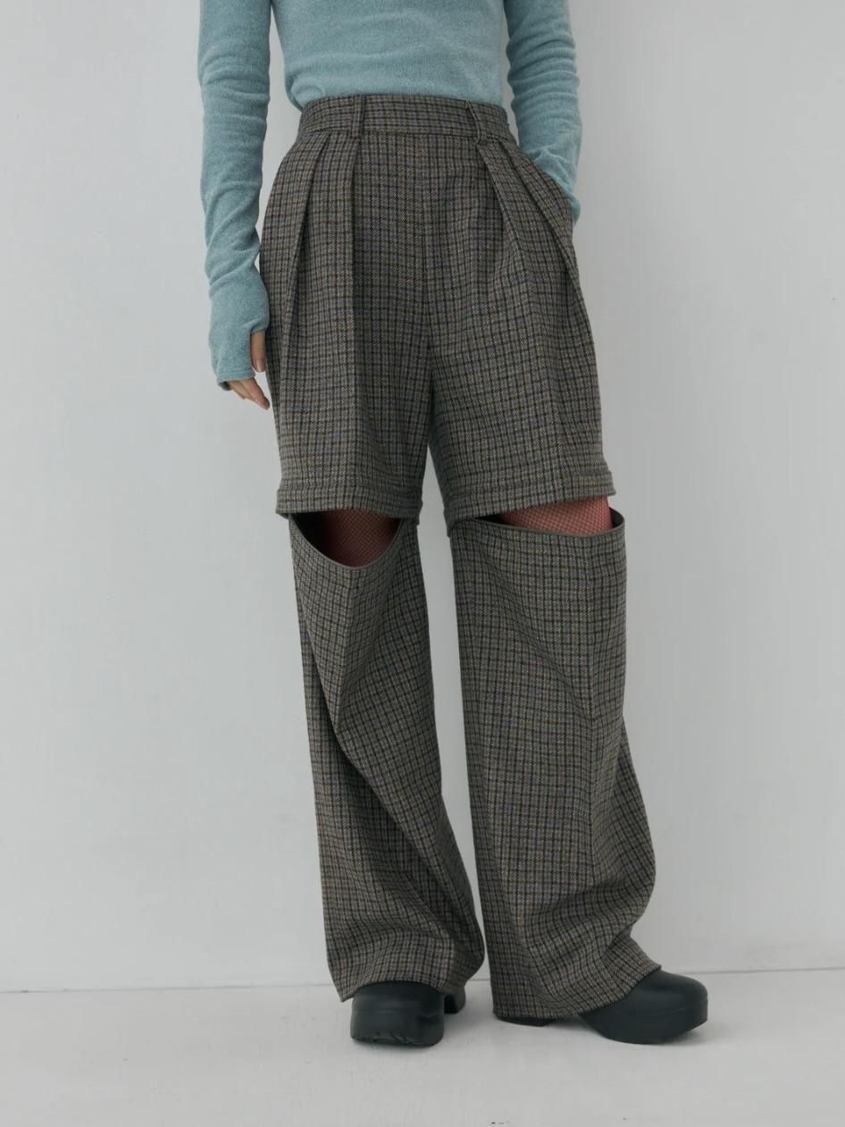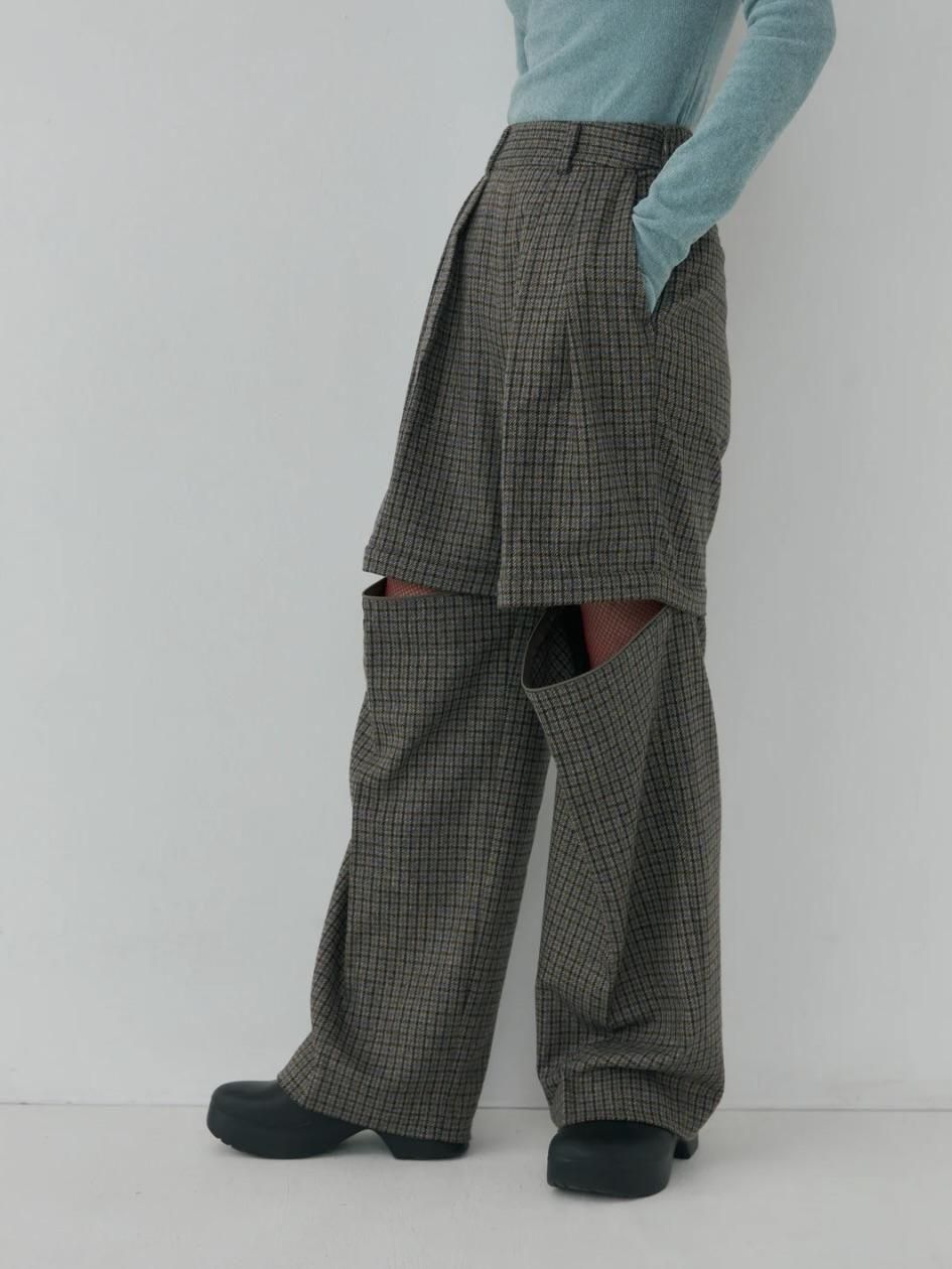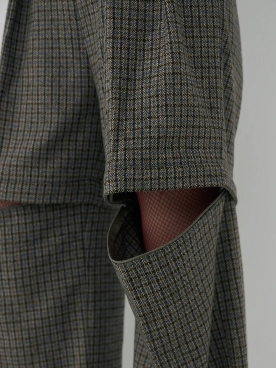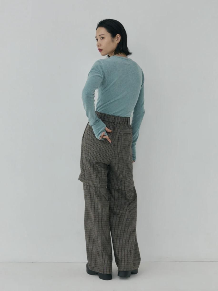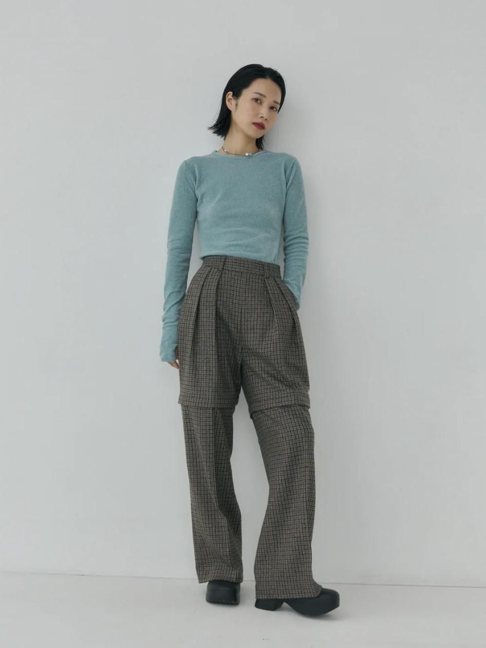 今シーズンは、反毛したリサイクルウールを使用したセンタープレスのセミワイドシルエット。異なるチェック柄の2柄での展開となります。柄により生地の厚みが変わり、同サイズですがフォルムの出かたや、落ち感が異なります。