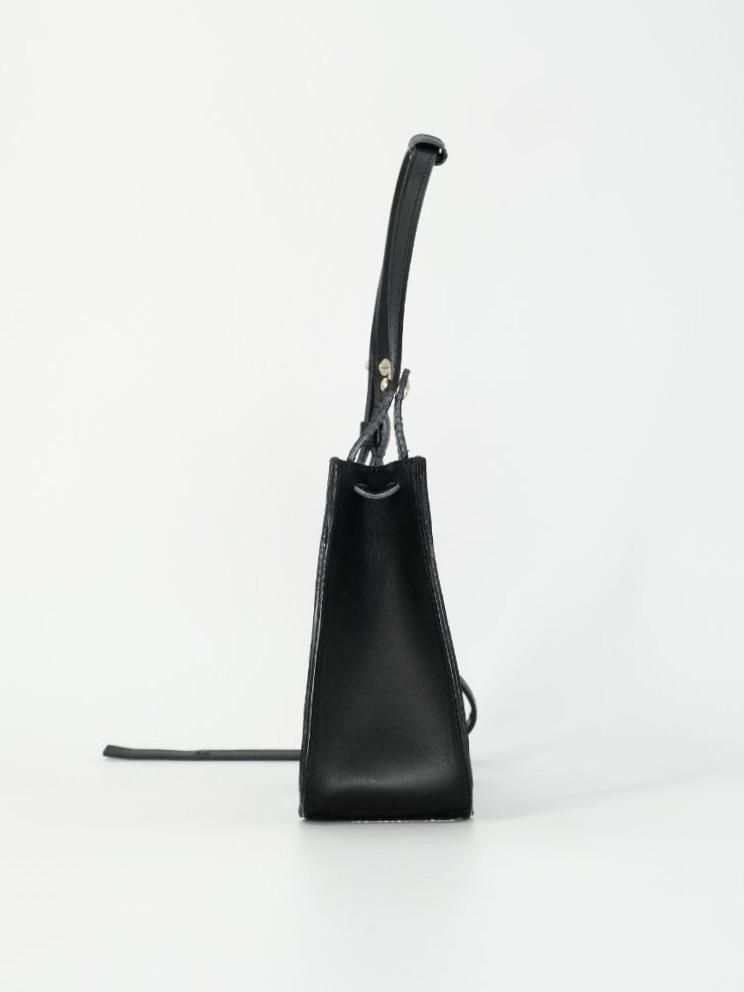 一見シンプルでラフな作りのように見えるが、裏地を付けつつ外縫いで作られたハンドバッグの仕立てになっており、形がしっかりと出るように底マチも重ねて作られている。