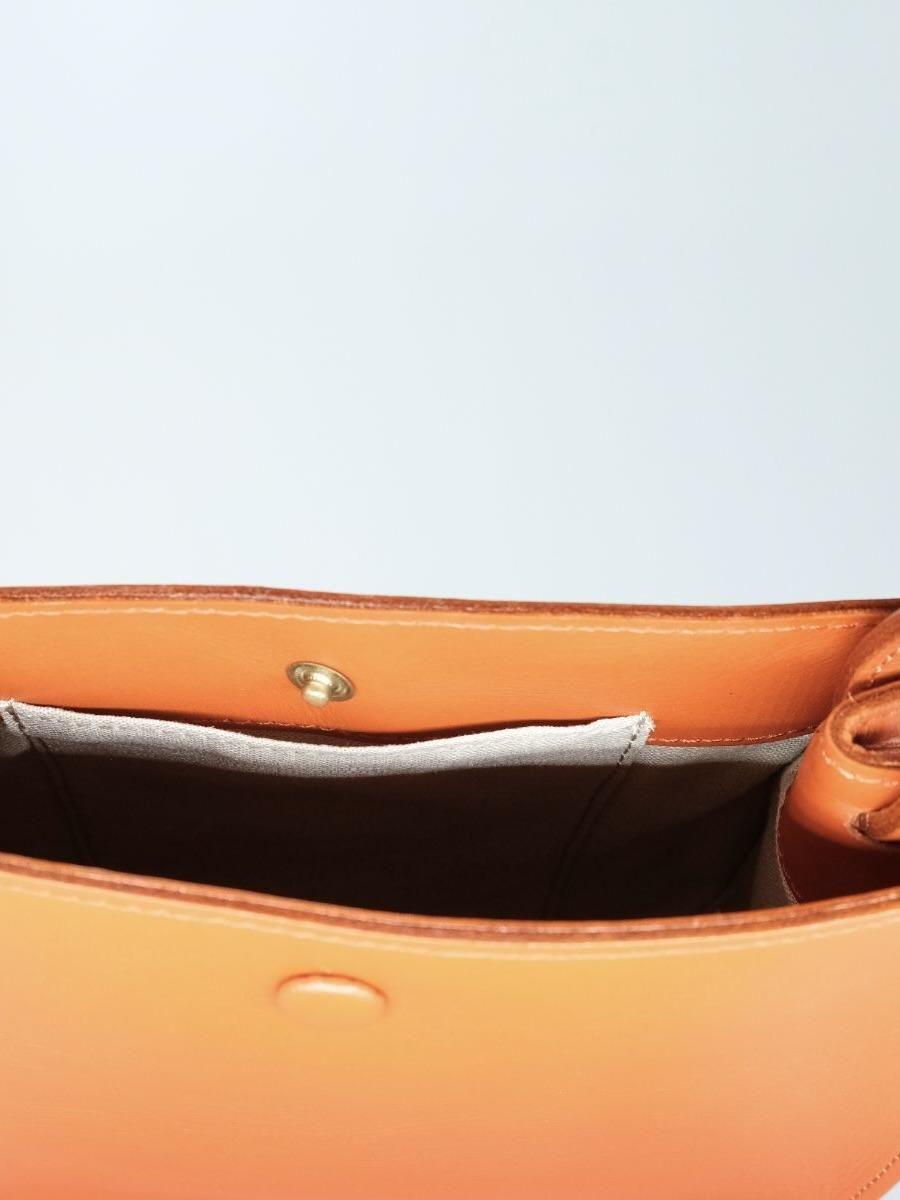 一見シンプルでラフな作りのように見えるが、裏地を付けつつ外縫いで作られたハンドバッグの仕立てになっており、形がしっかりと出るように底マチも重ねて作られている。