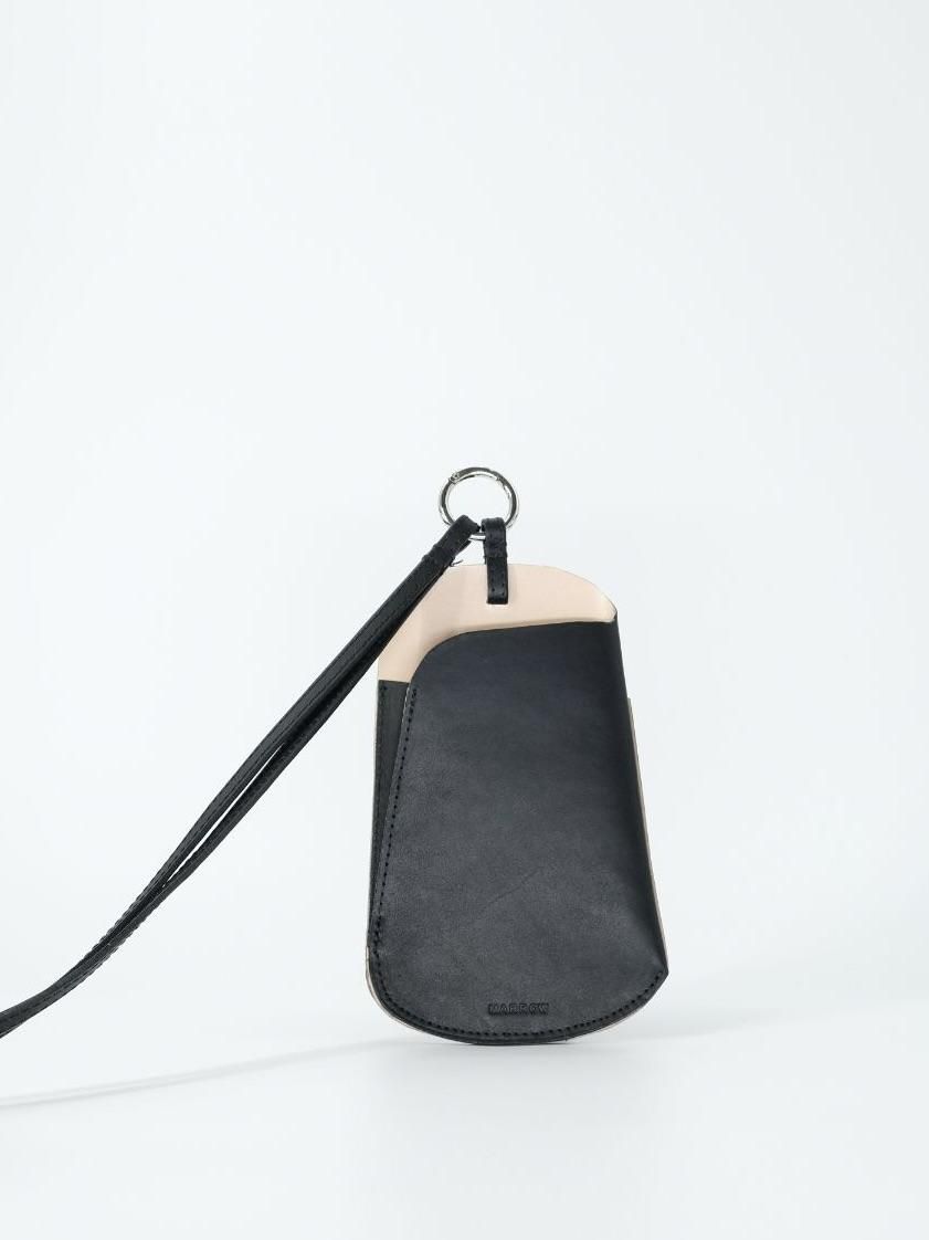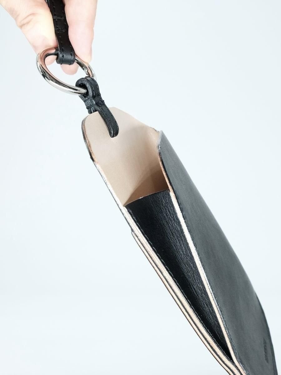 定番の財布などと同様に、薄く漉いたスムース革とヌメ革を貼り合わせ1枚仕立てで作られている。